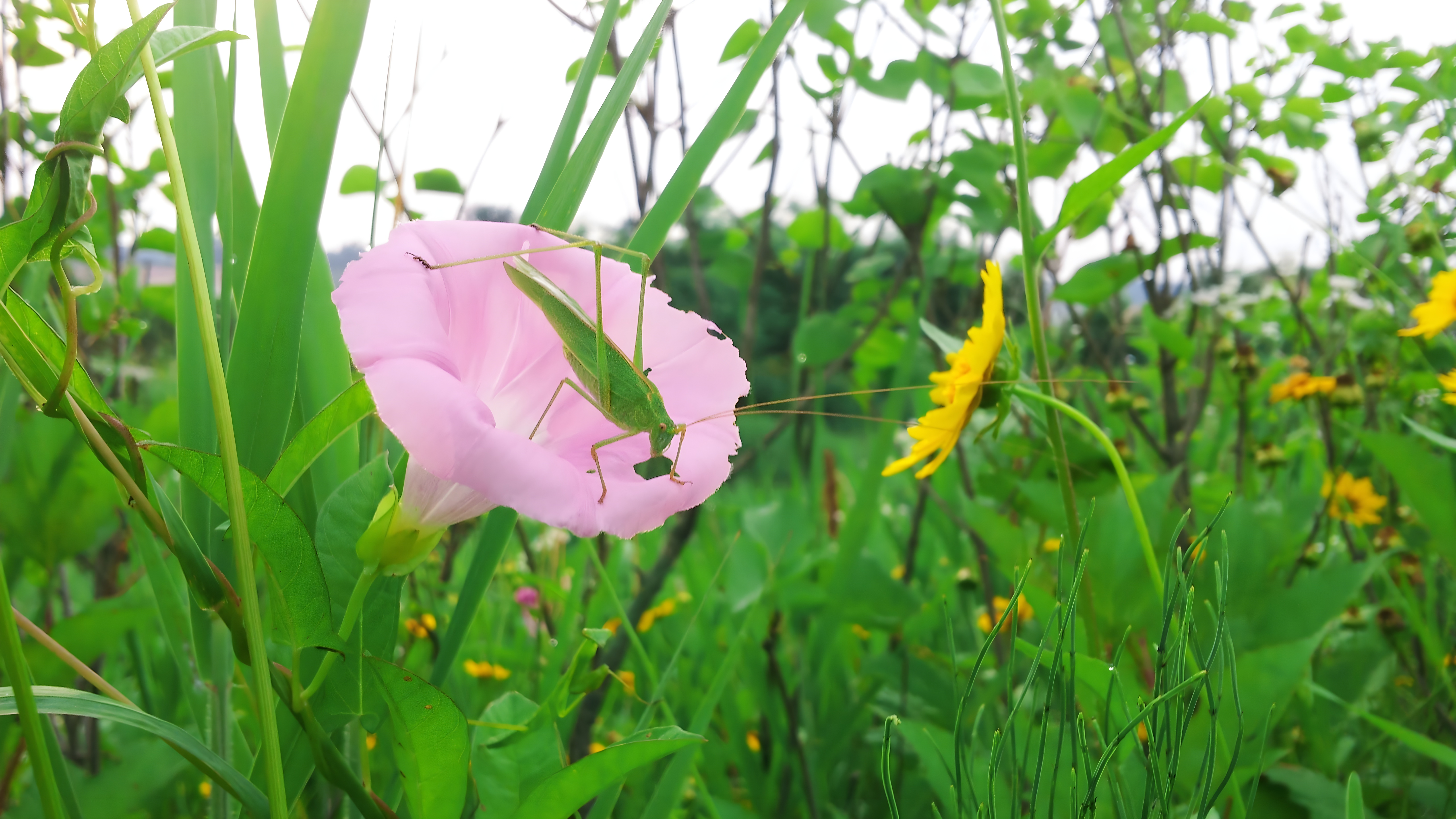 메꽃을 갉아먹는 실베짱이 #꽃 #메꽃 #베짱이 #실베짱이 #큰금계국 #풀밭 [원본: 해상도 = 6528x3672, 크기 = 3.3MiB]