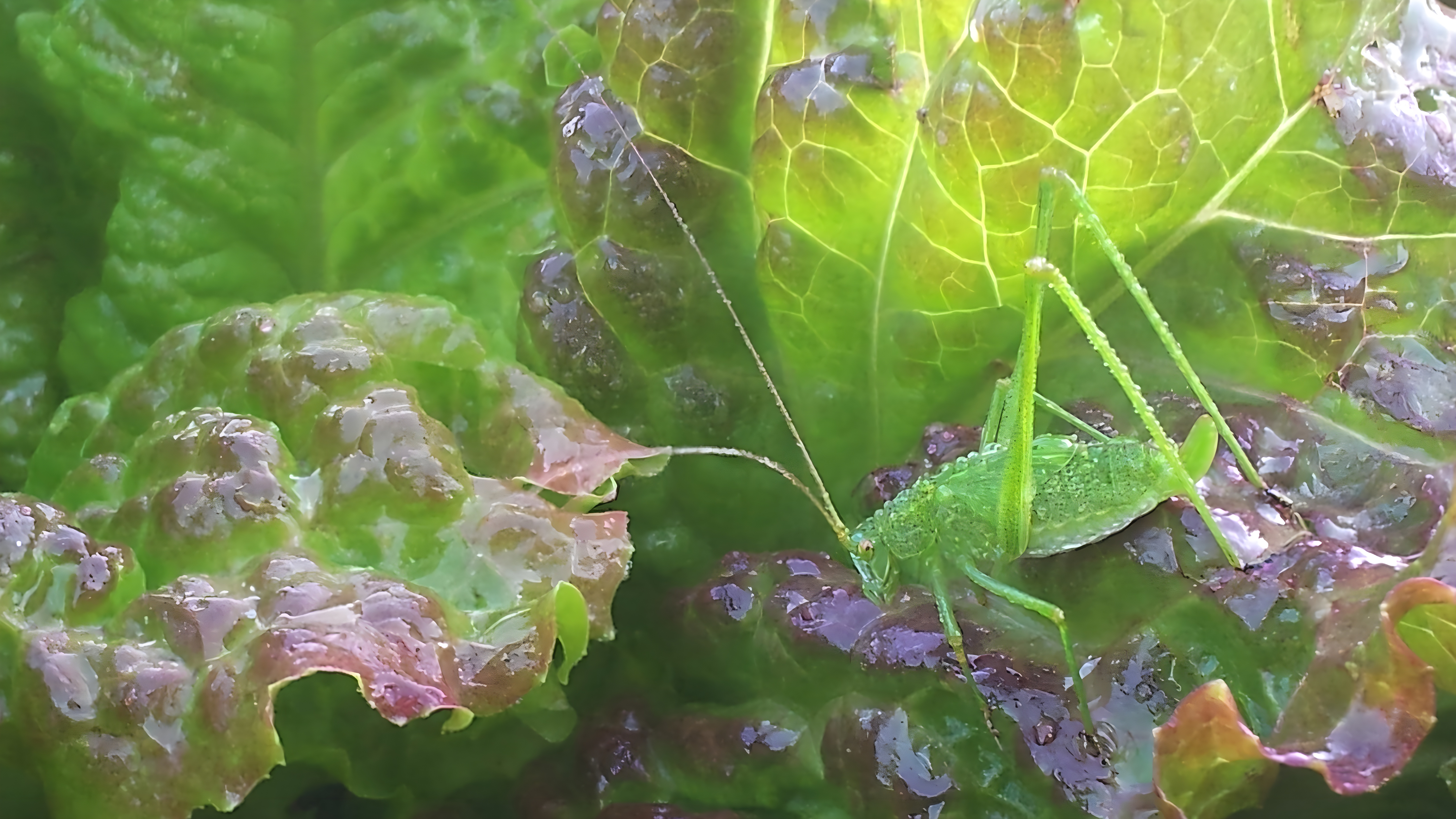 상추잎의 어린 실베짱이 #물방울 #잎 #상추잎 #상추 #베짱이 #실베짱이 #약충 [원본: 해상도 = 6528x3672, 크기 = 4.7MiB]