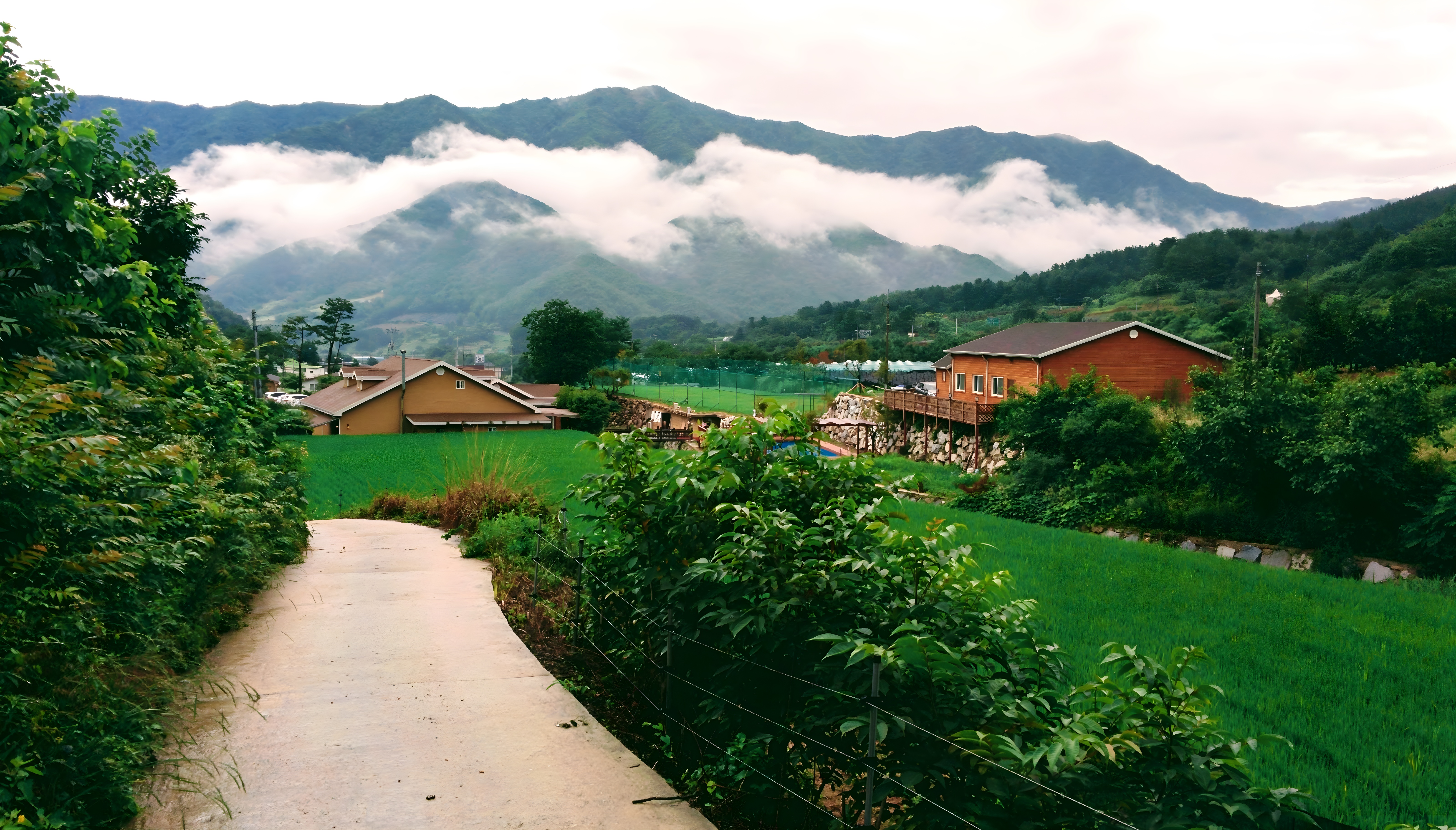안개에 덮힌 무주구천동 #풍경 #산골 #논 #펜션 #안개 #산 #무주군 [원본: 해상도 = 6400x3648, 크기 = 5.9MiB]