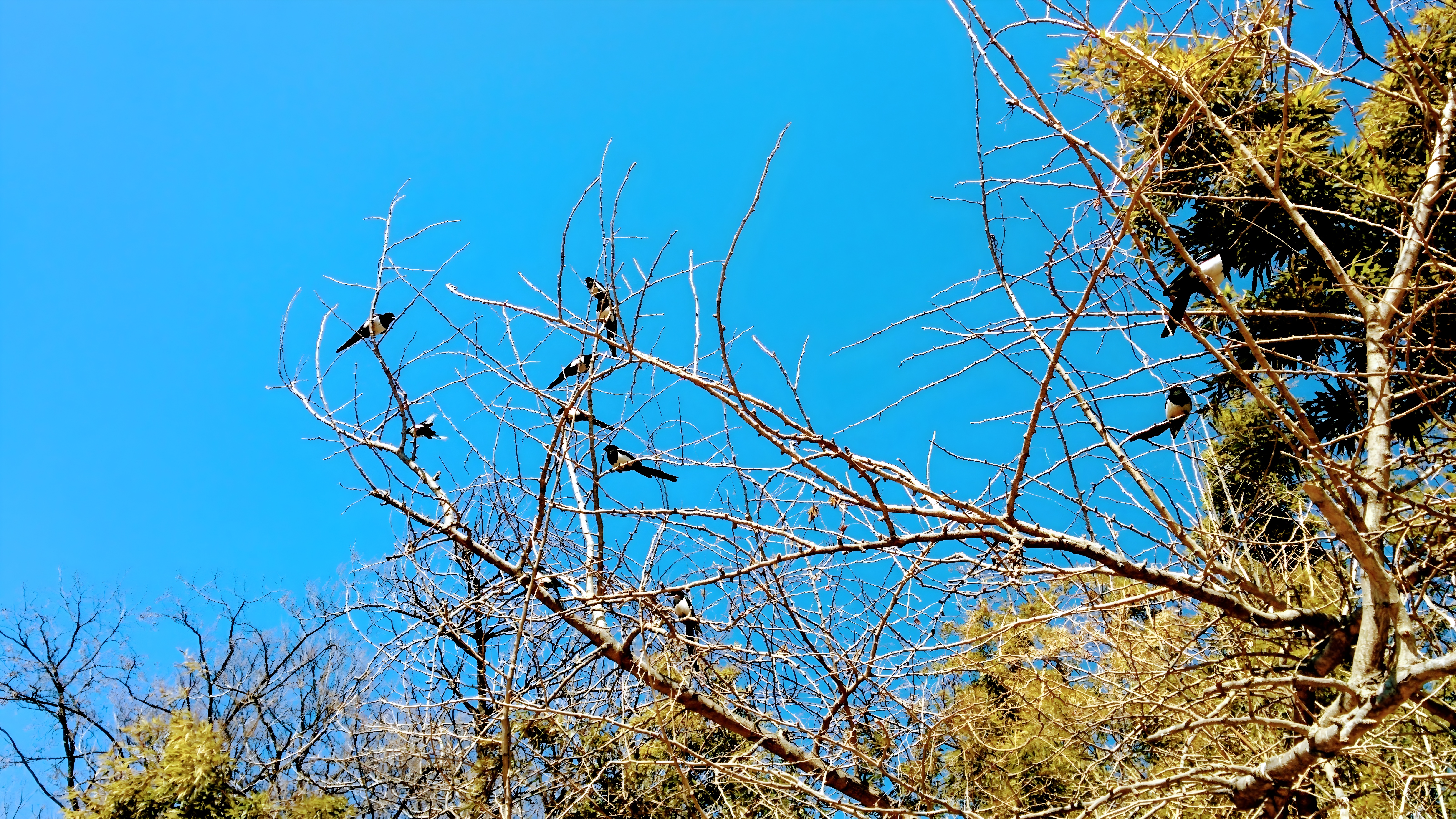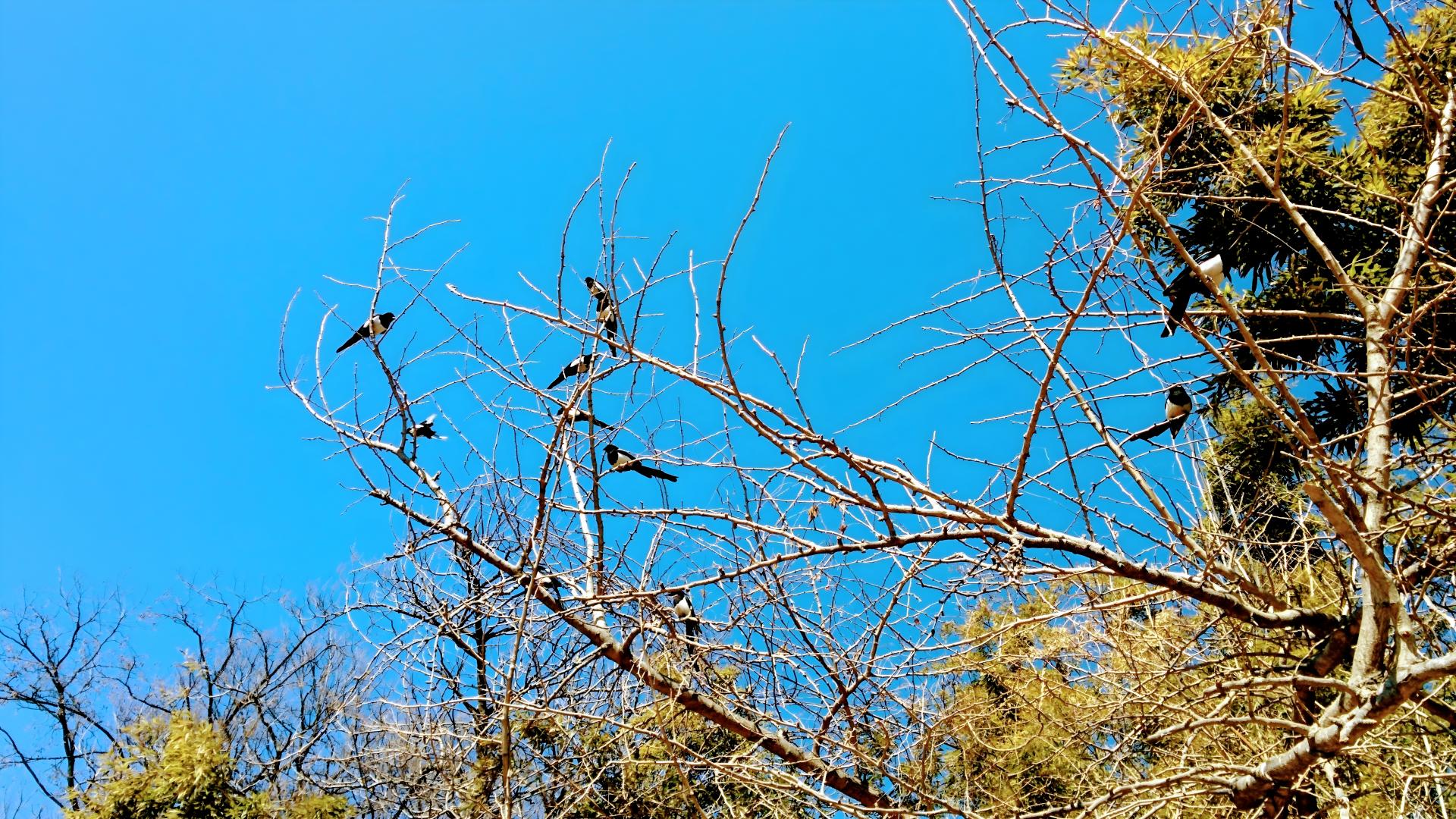 나뭇가지에 모인 까치떼 #나뭇가지 #새 #까치 #하늘 [원본: 해상도 = 6400x3600, 크기 = 9.2MiB]
