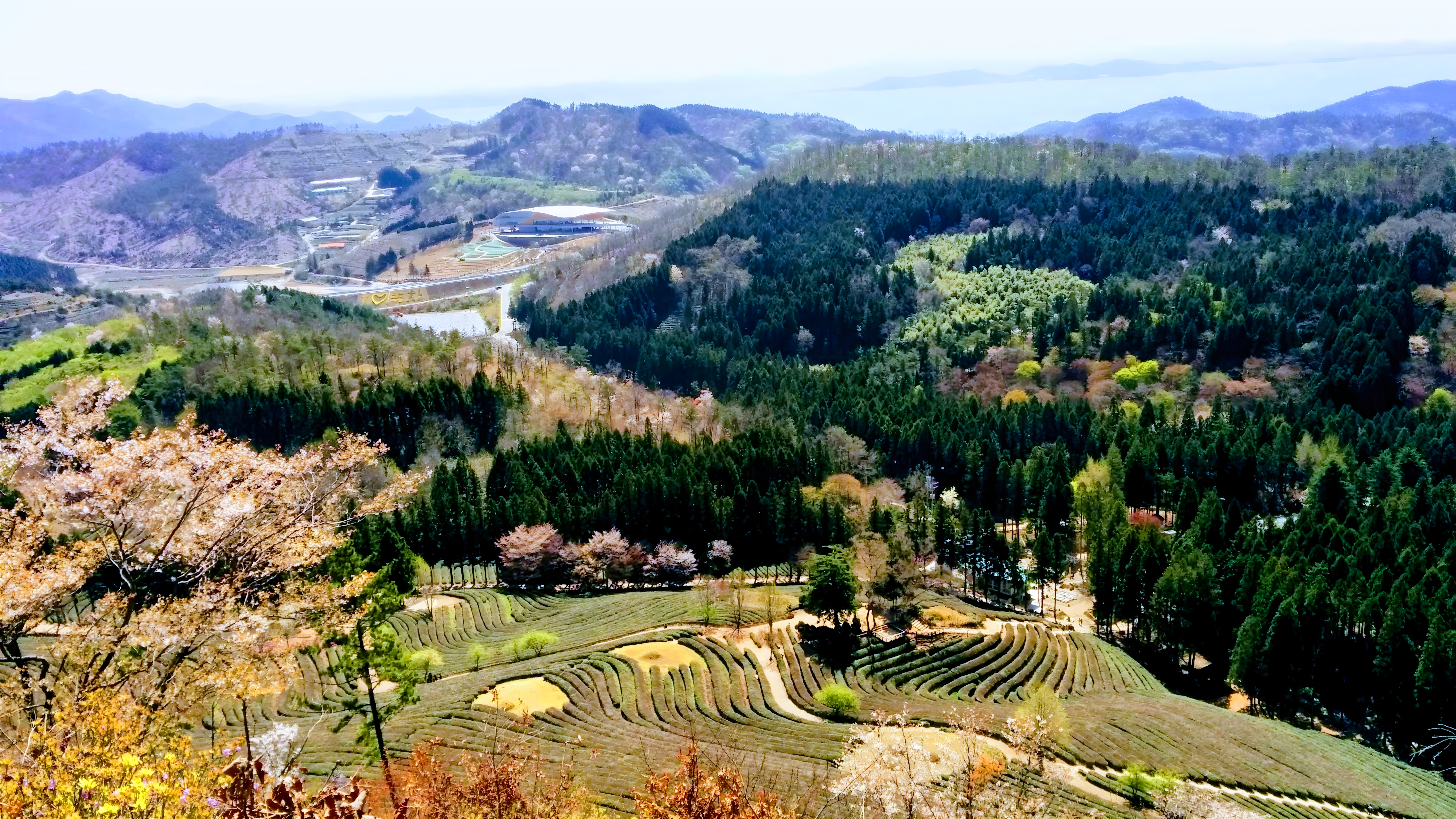늦은 벚꽃이 반기는 보성녹차밭 풍경 #차밭 #보성 #보성차밭 #풍경 #산 #바다 [원본: 해상도 = 6528x3672, 크기 = 7.5MiB]