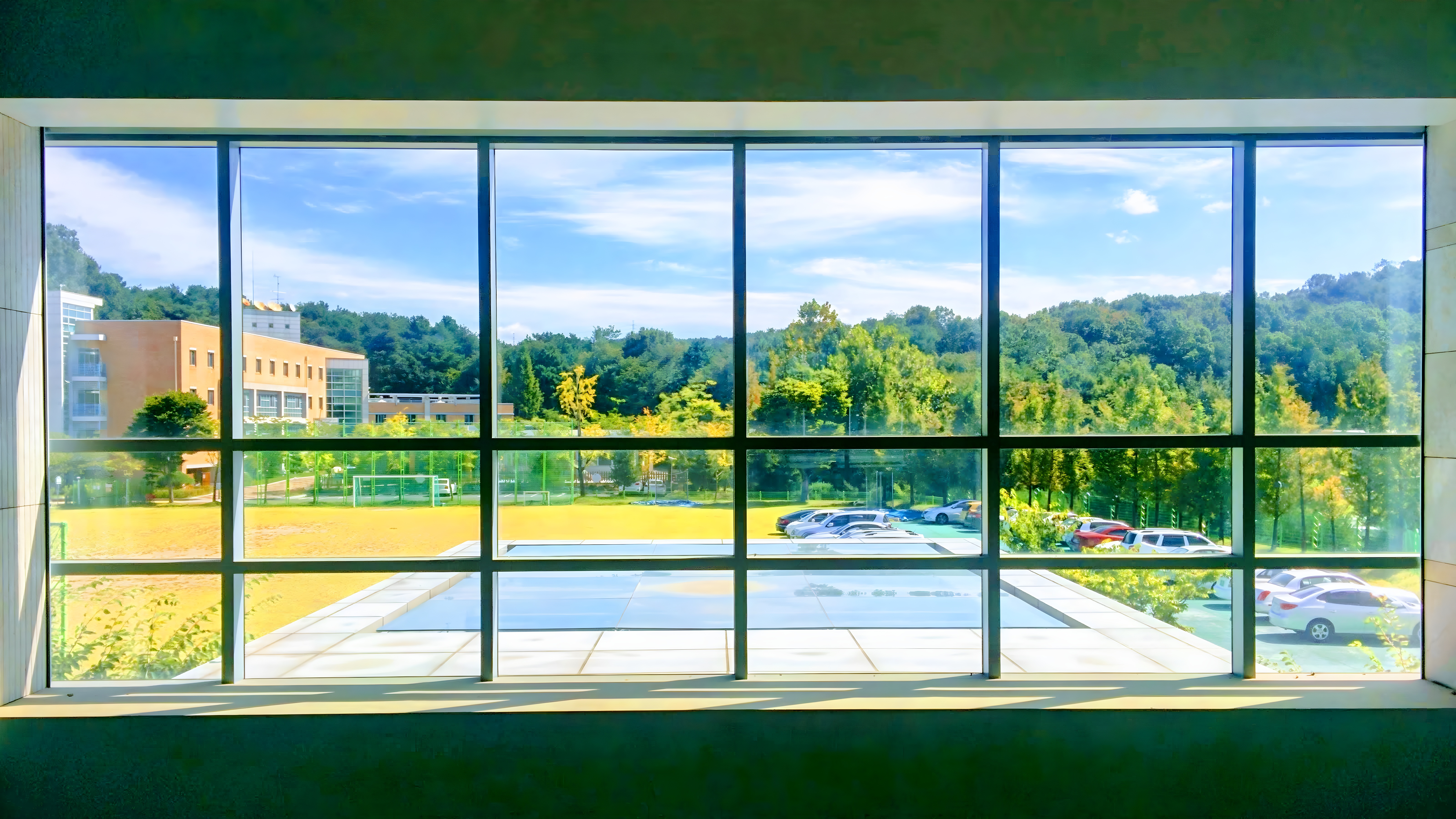 창밖의 풍경 #창문 #햇살 #운동장 #자동차 [원본: 해상도 = 6400x3600, 크기 = 5.4MiB]