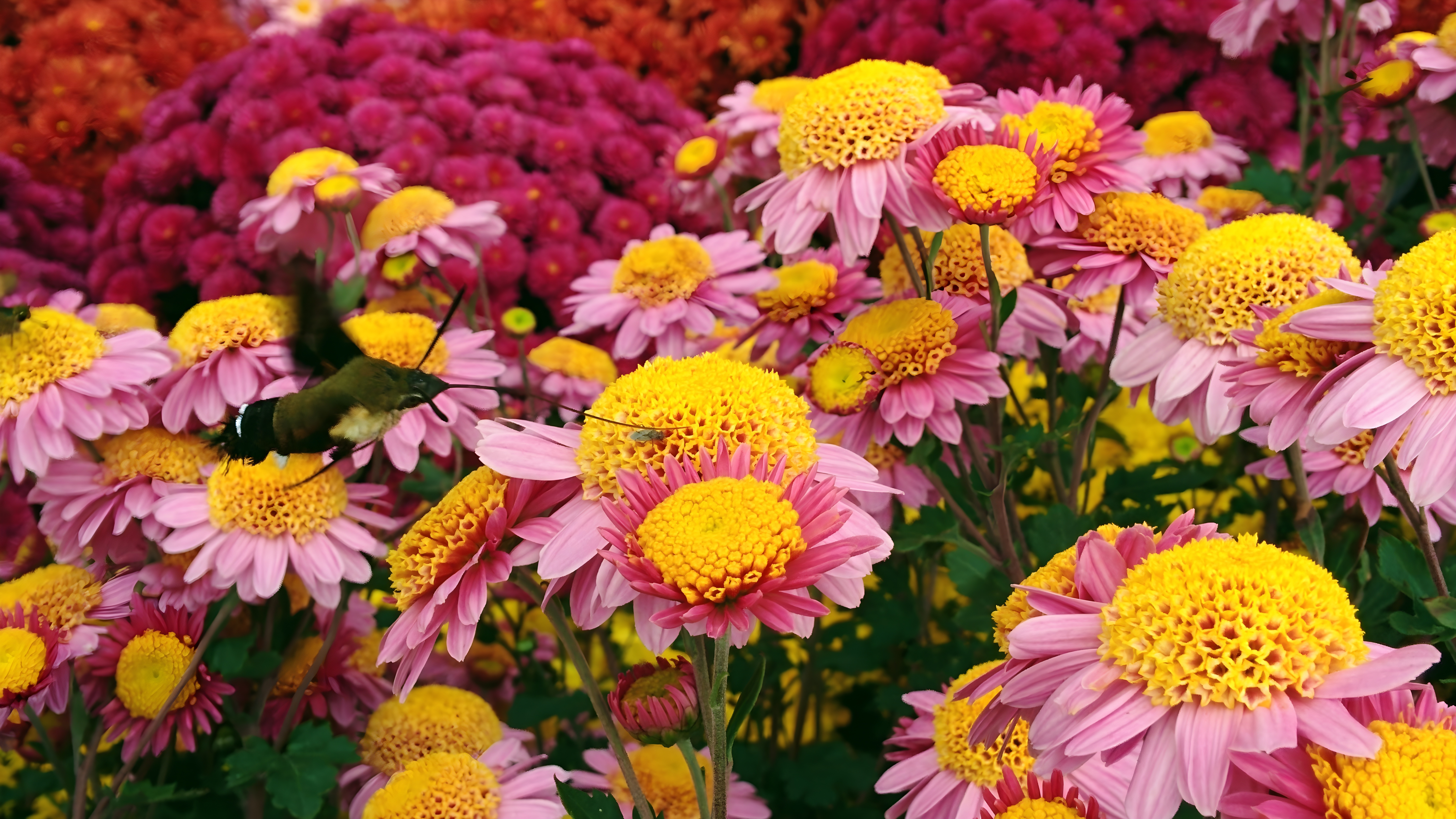 분홍색 국화꽃의 작은검은꼬리박각시(추정)