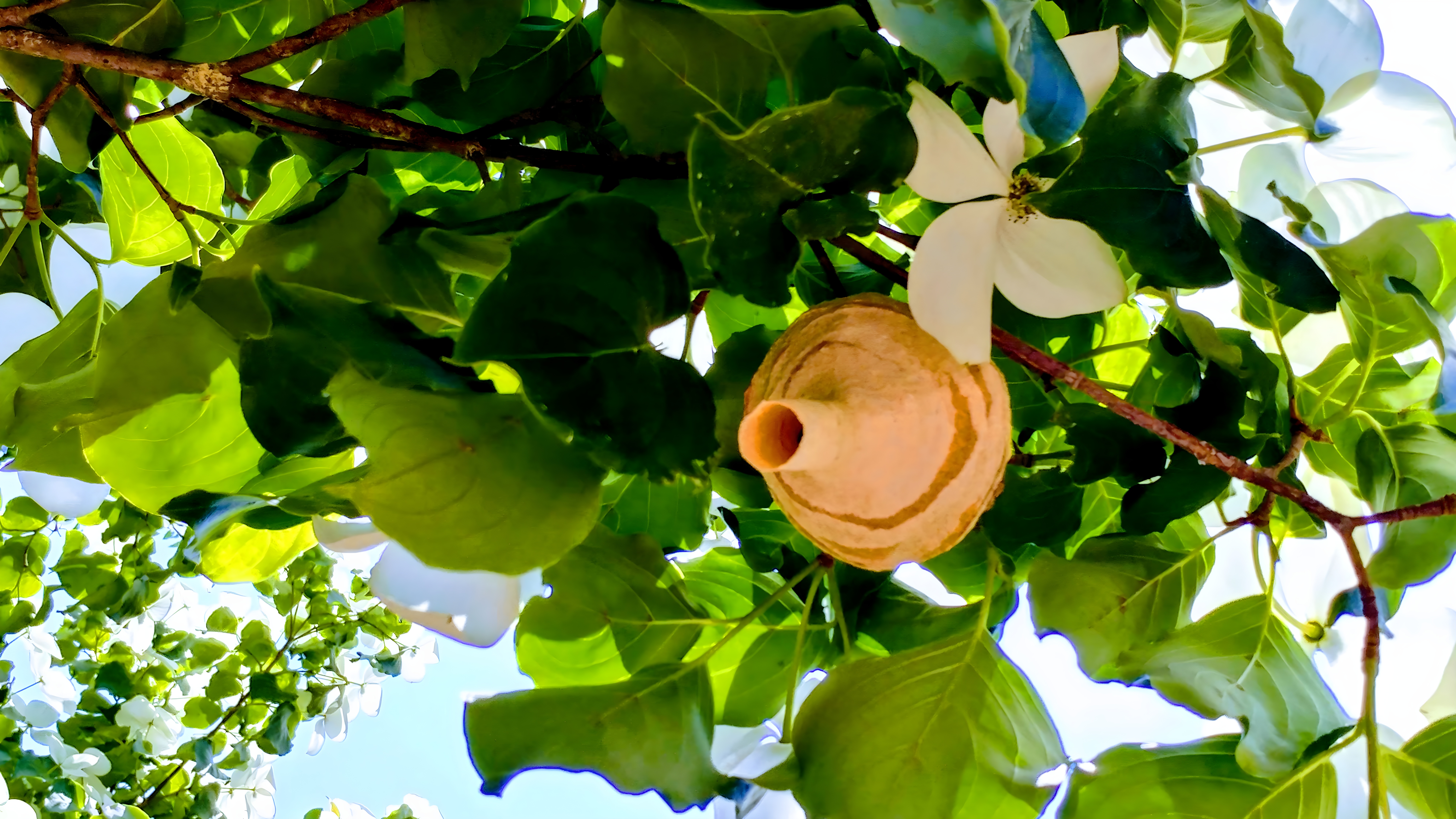 산딸나무 꽃 옆에 지은 호리병 모양 벌집(아마도 호리병벌)
