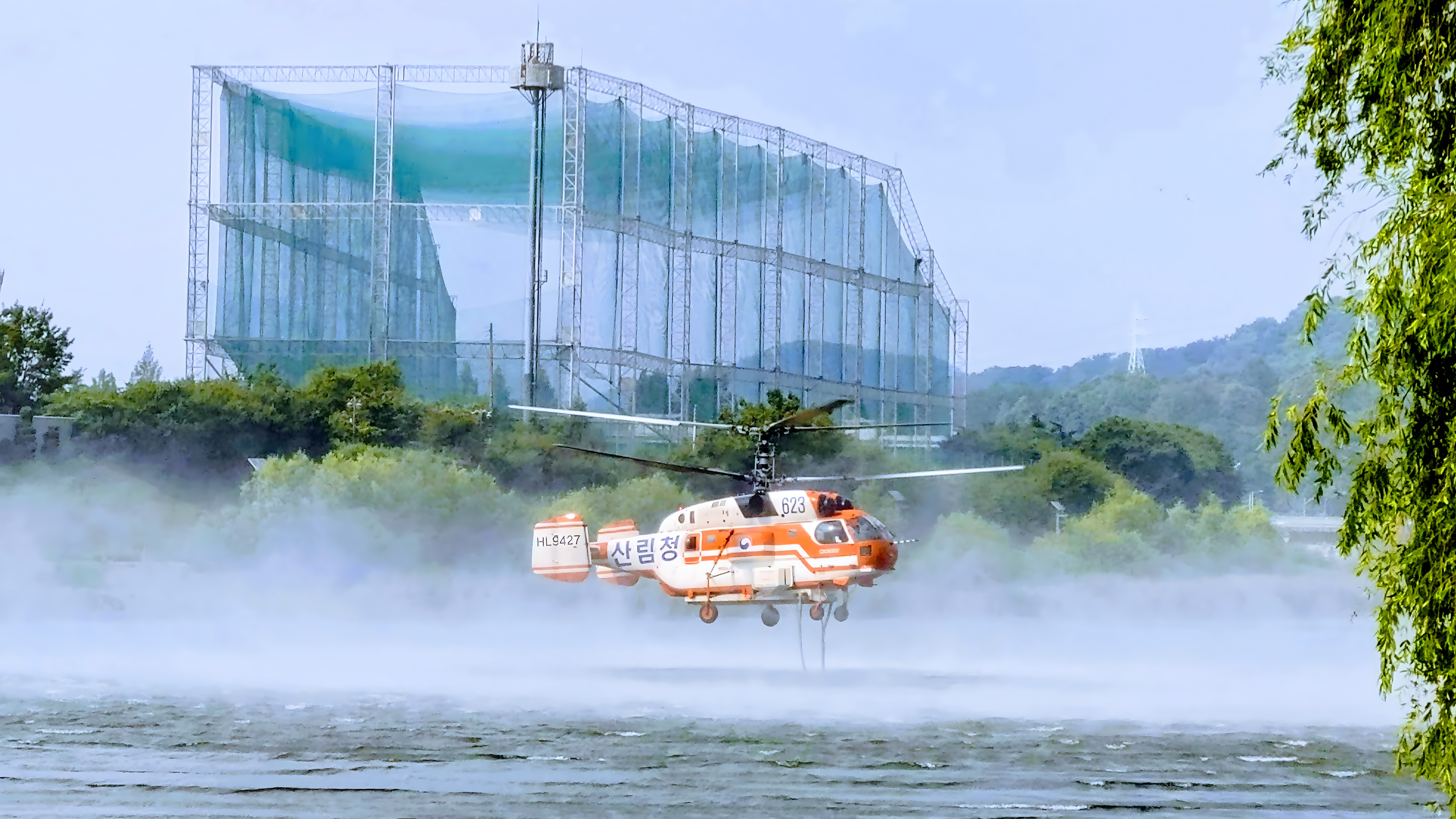 갑천에서 물을 공수하는 산림청 헬리콥터