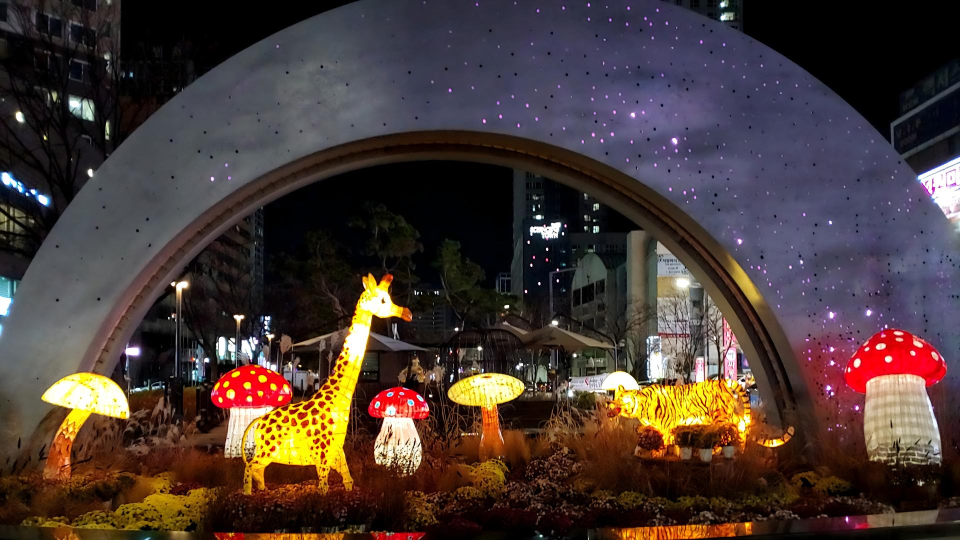 거리를 밝히는 조명 조형물 #조형물 #조명 #조명인형 #기린 #범 #버섯 [원본: 해상도 = 8064x4536, 크기 = 5.9MiB]