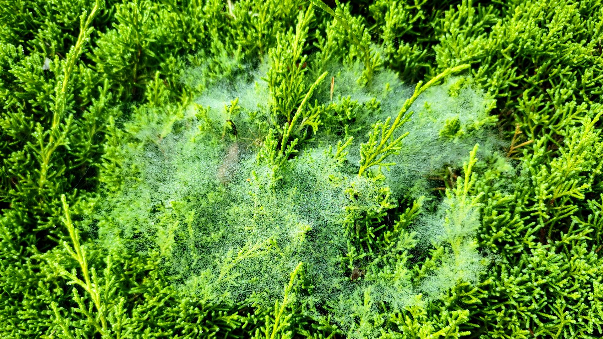 눈향나무에 이슬 머금은 거미줄의 애풀거미(추정)