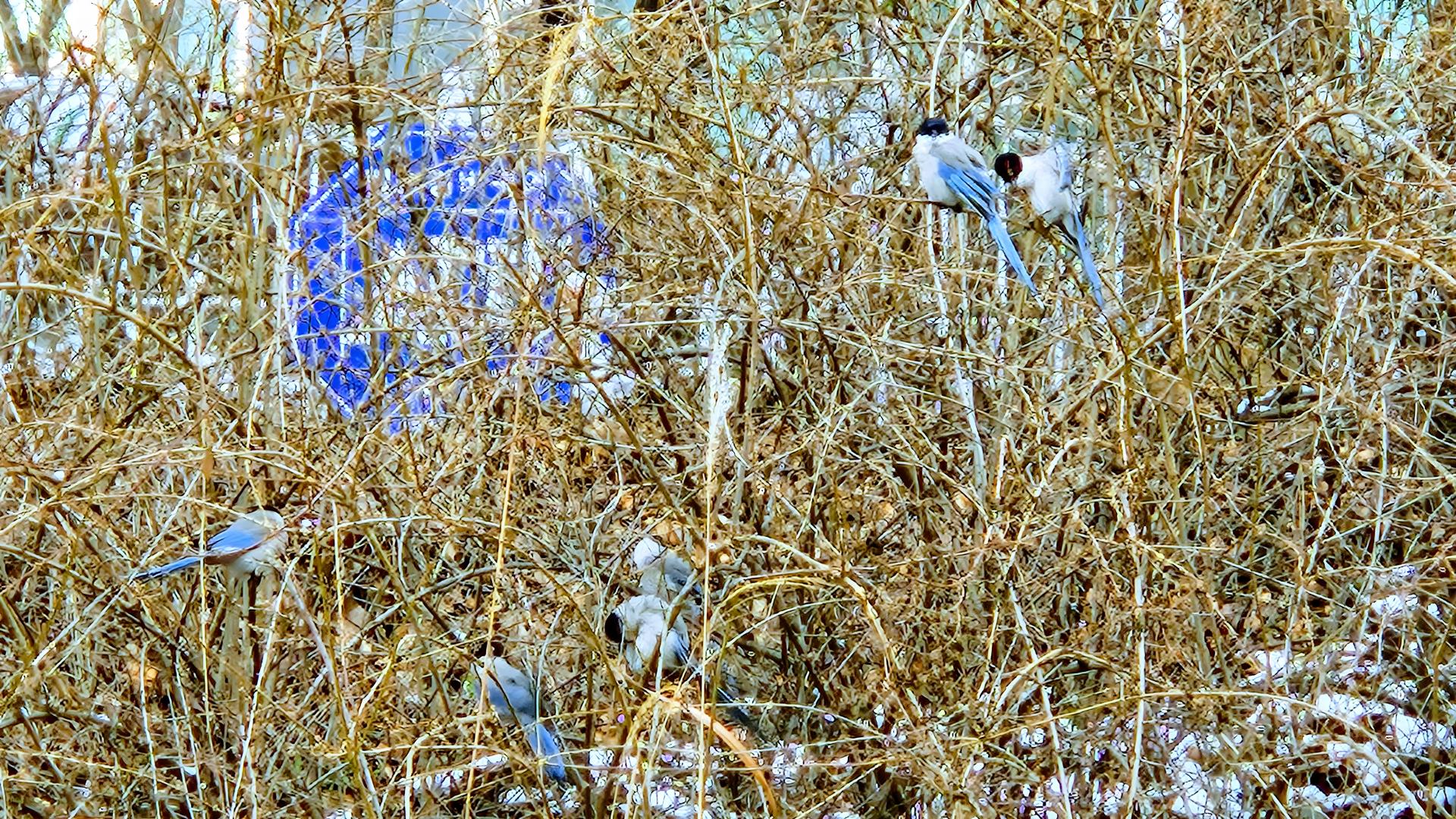 겨울 풀섶의 물까치떼 #풀섶 #새 #물까치 [원본: 해상도 = 8000x4500, 크기 = 12.8MiB]