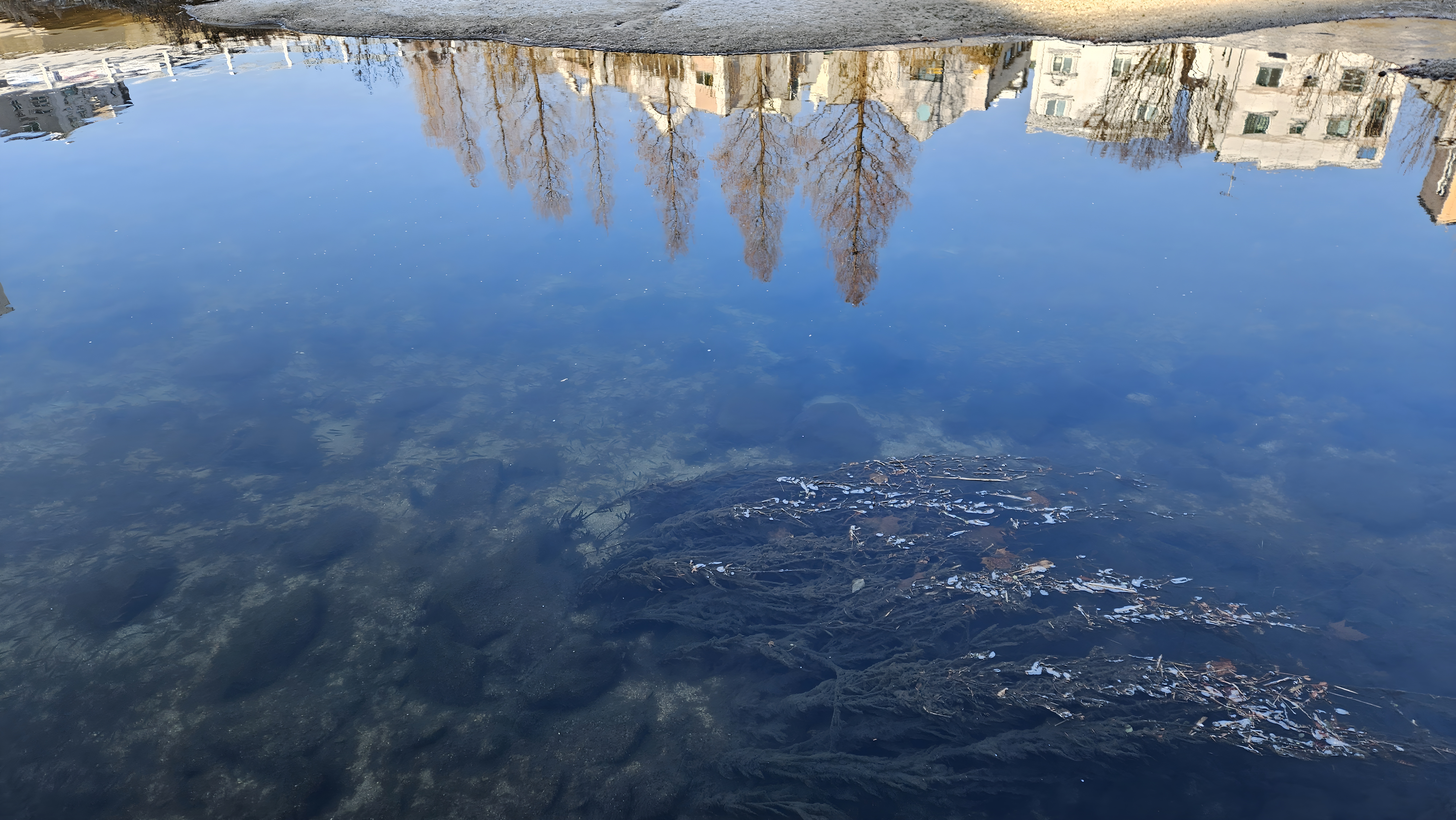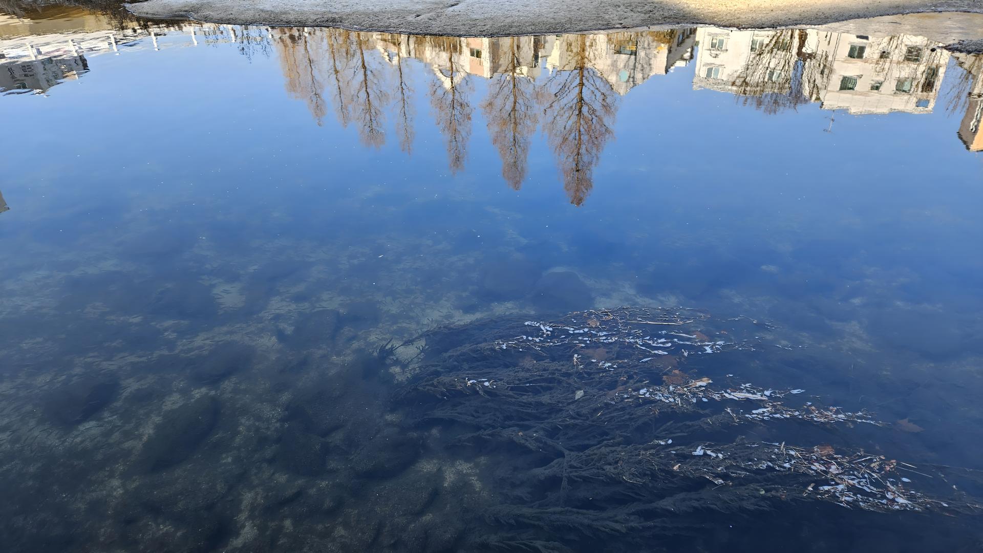 물거울에 비친 가로수와 집들