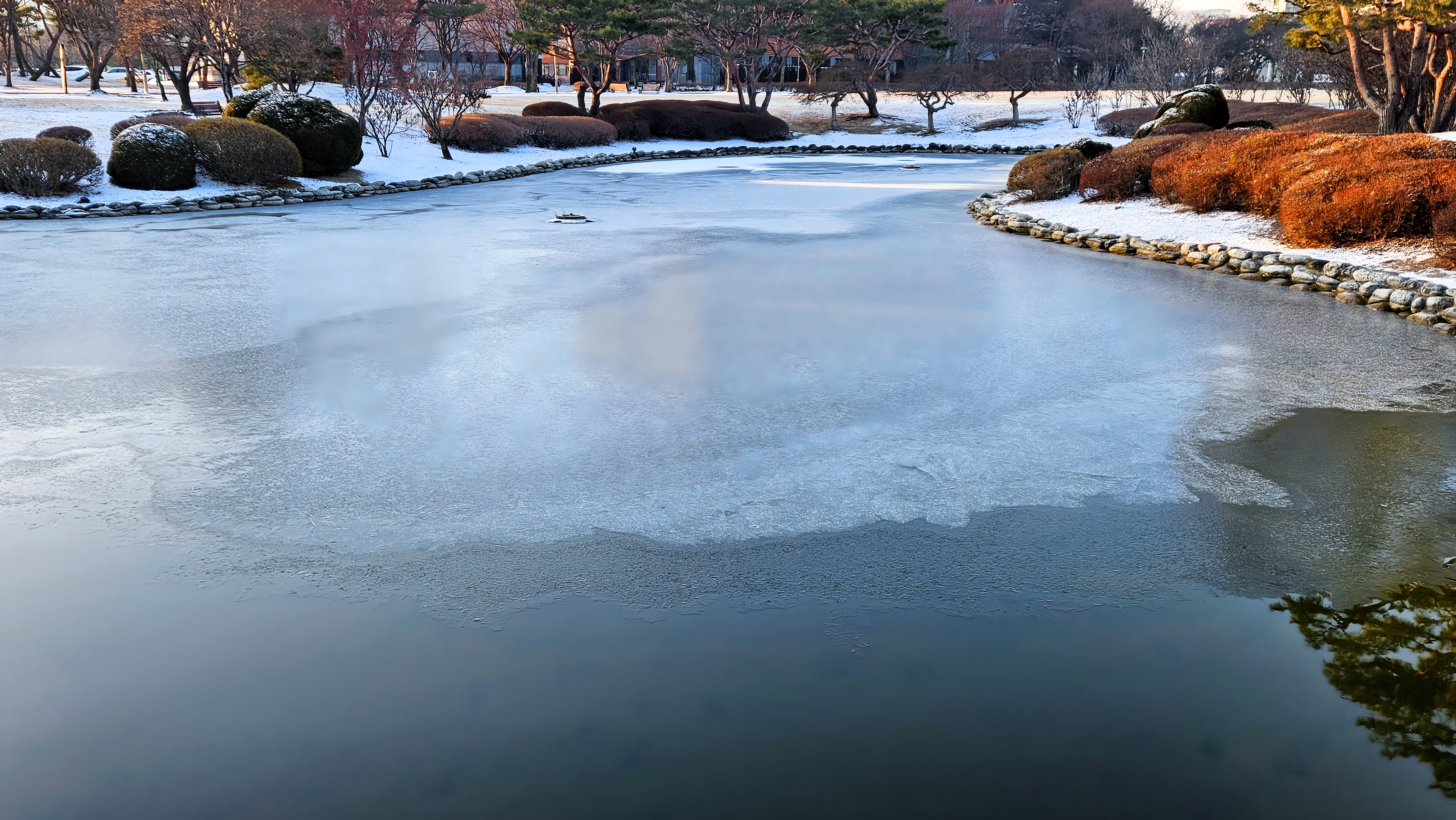 연못의 얼음 위로 눈내린 아침 풍경. KAIST 오리연못.