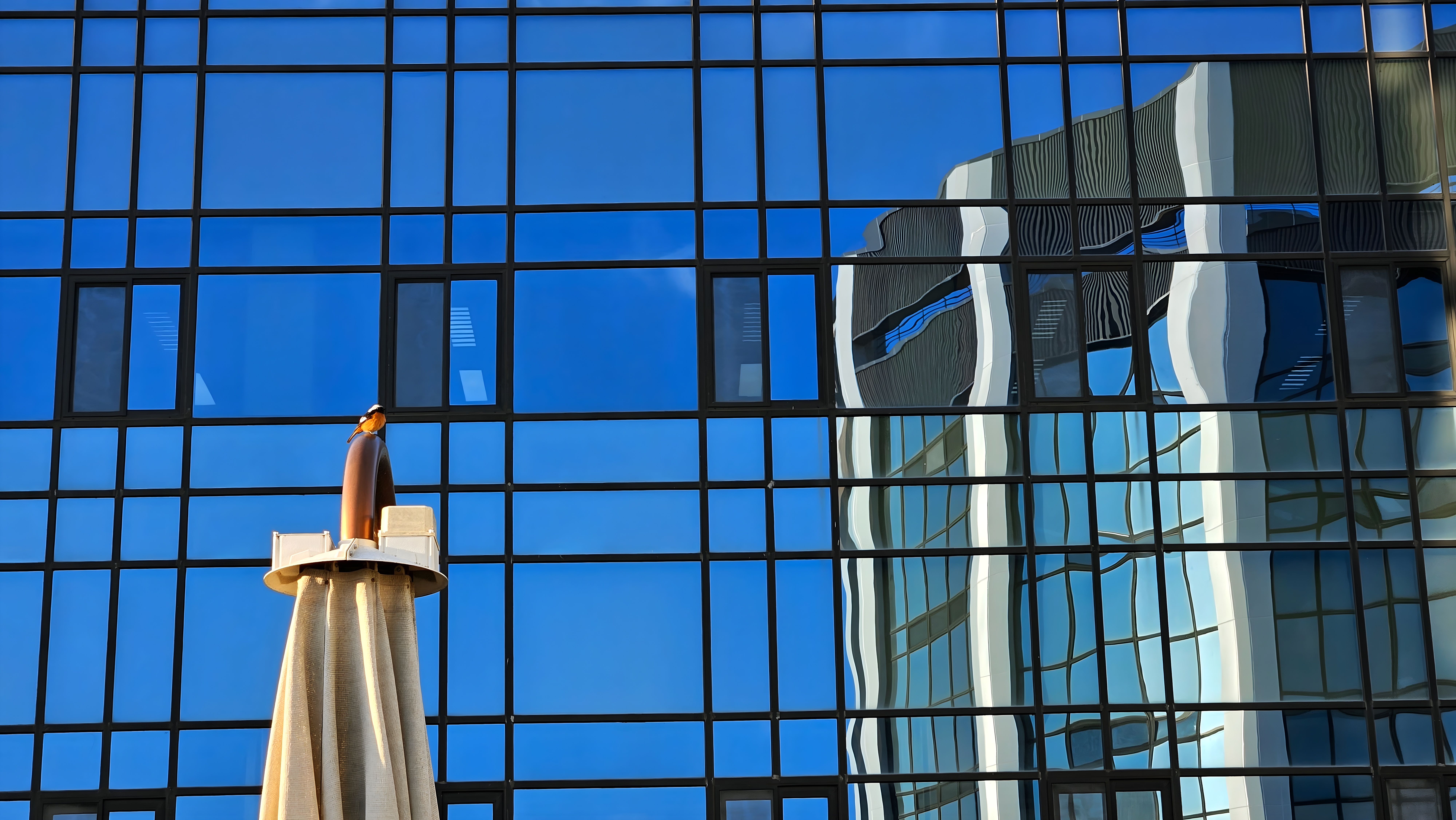 건물 유리창을 배경으로 쉬는 딱새 수컷