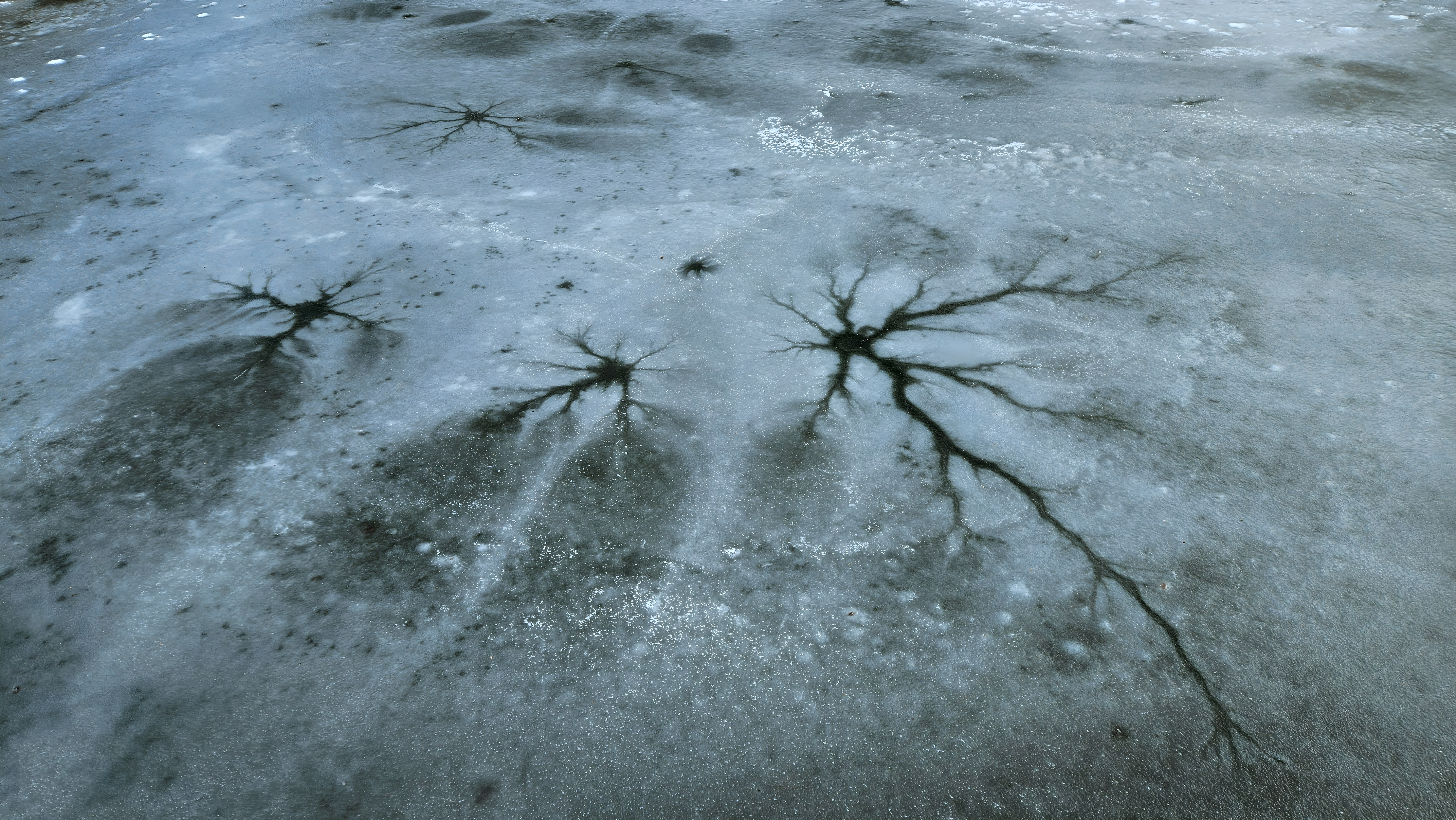 나뭇가지 모양으로 깨진 얼음 구멍 #냇물 #얼음 #수지상균열 #덴드라이트 [원본: 해상도 = 8000x4504, 크기 = 10MiB]