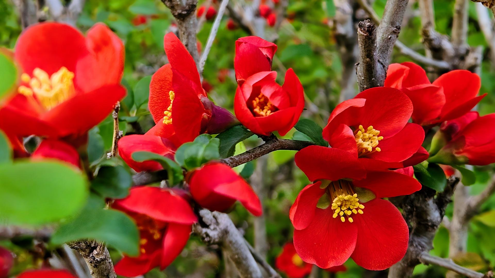 명자나무가 화려한 빨간 꽃을 피우다. #꽃 #명자나무 #명자꽃 [원본: 해상도 = 8000x4504, 크기 = 6.4MiB]