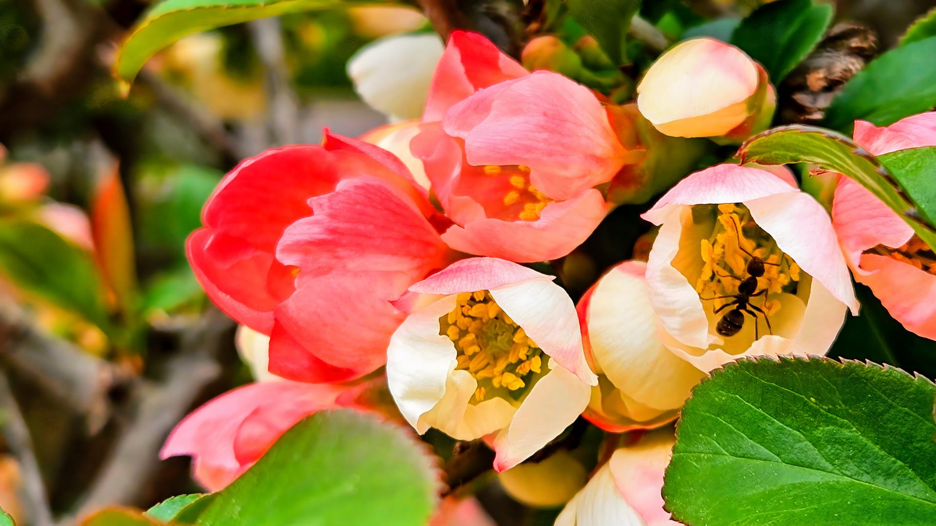 명자나무 꽃을 찾은 일본왕개미(추정) #꽃 #명자꽃 #명자나무 #개미 #일본왕개미 [원본: 해상도 = 8000x4504, 크기 = 5.6MiB]