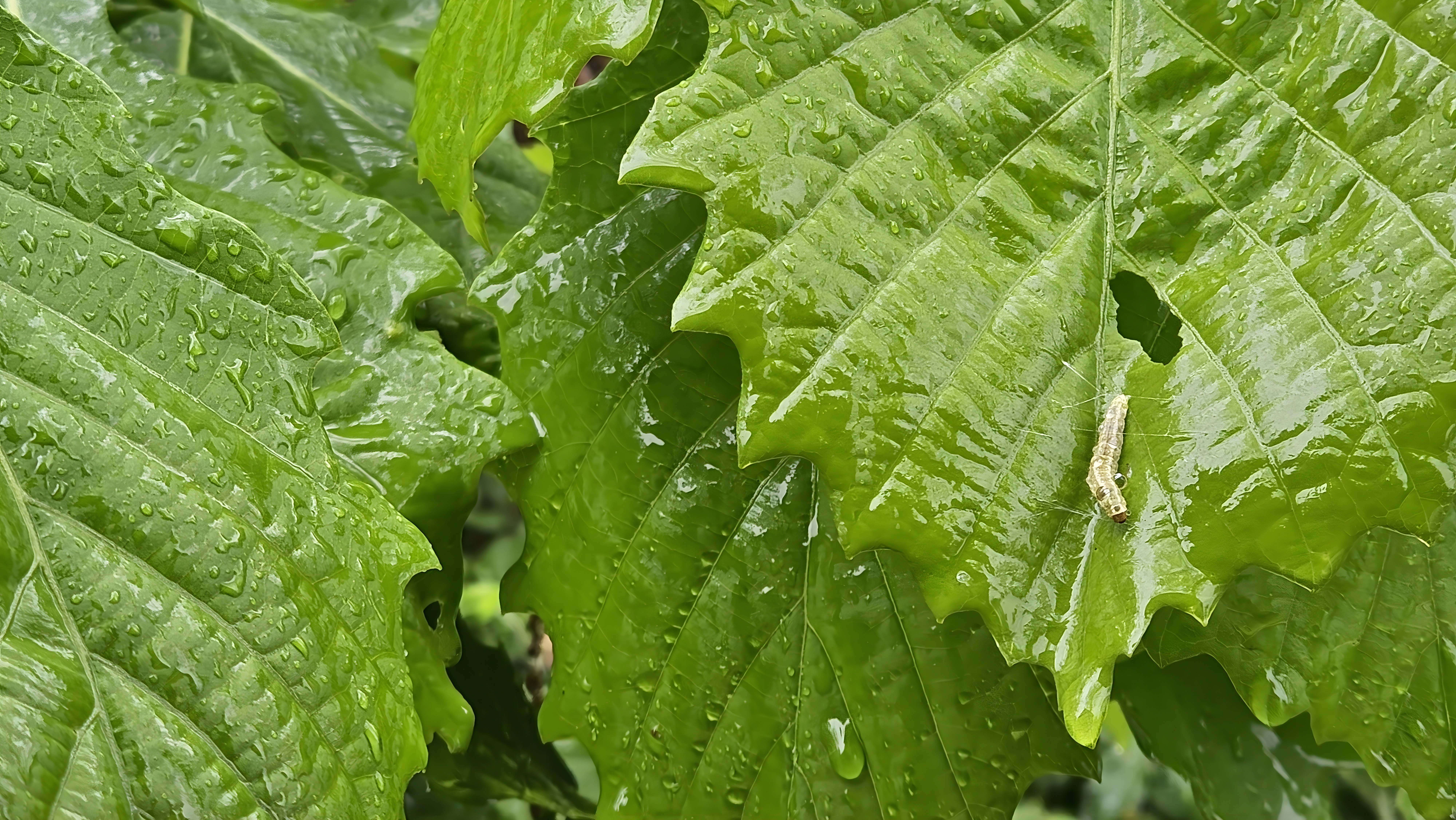 비속에 실을 뿜어 고치를 짓는 잎말이나방(추정) 애벌레