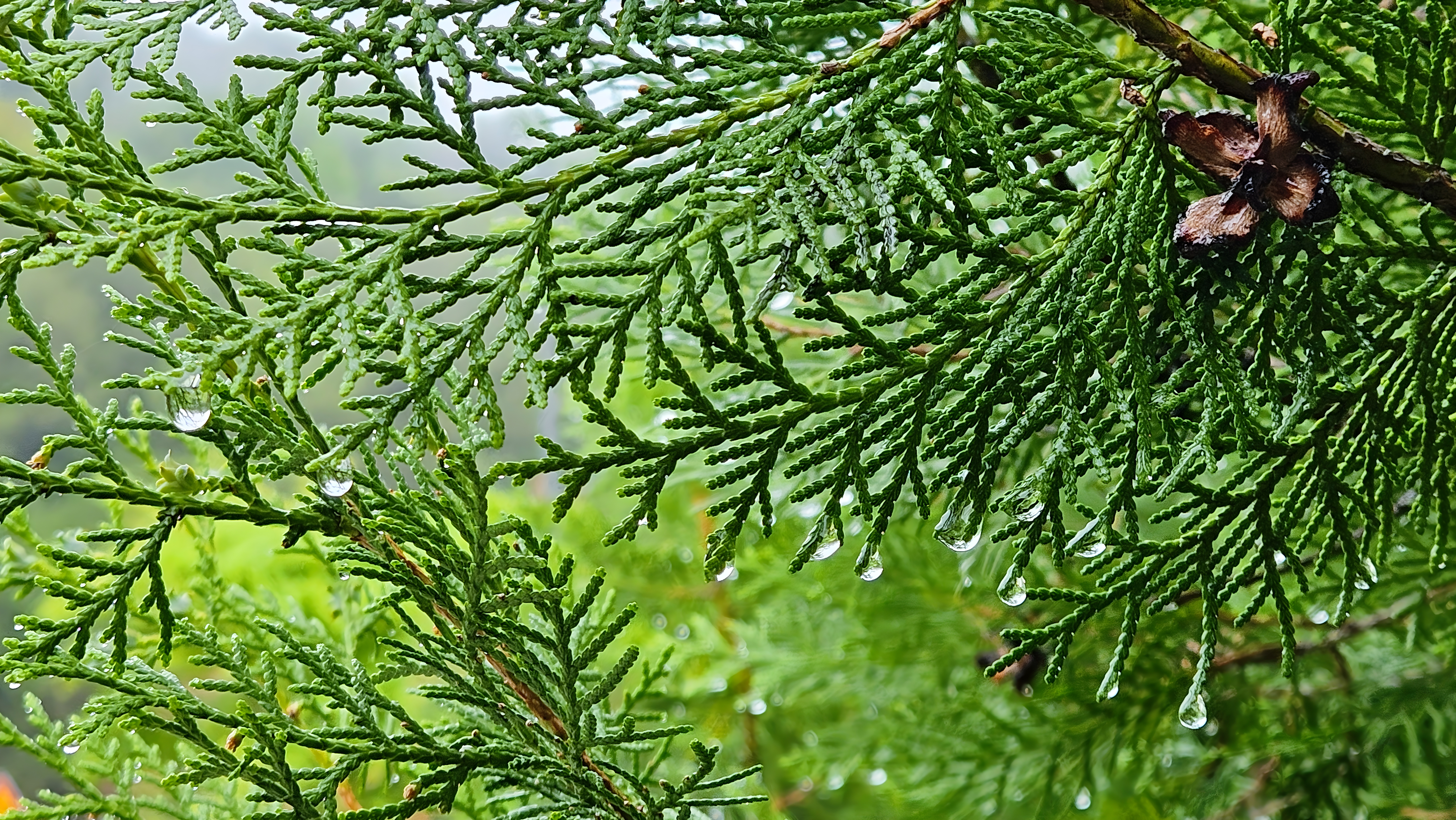 빗방우리 맺힌 측백나무 이파리 #잎 #나뭇잎 #측백나무 #열매 #씨앗 #물방울 [원본: 해상도 = 8000x4504, 크기 = 10.3MiB]