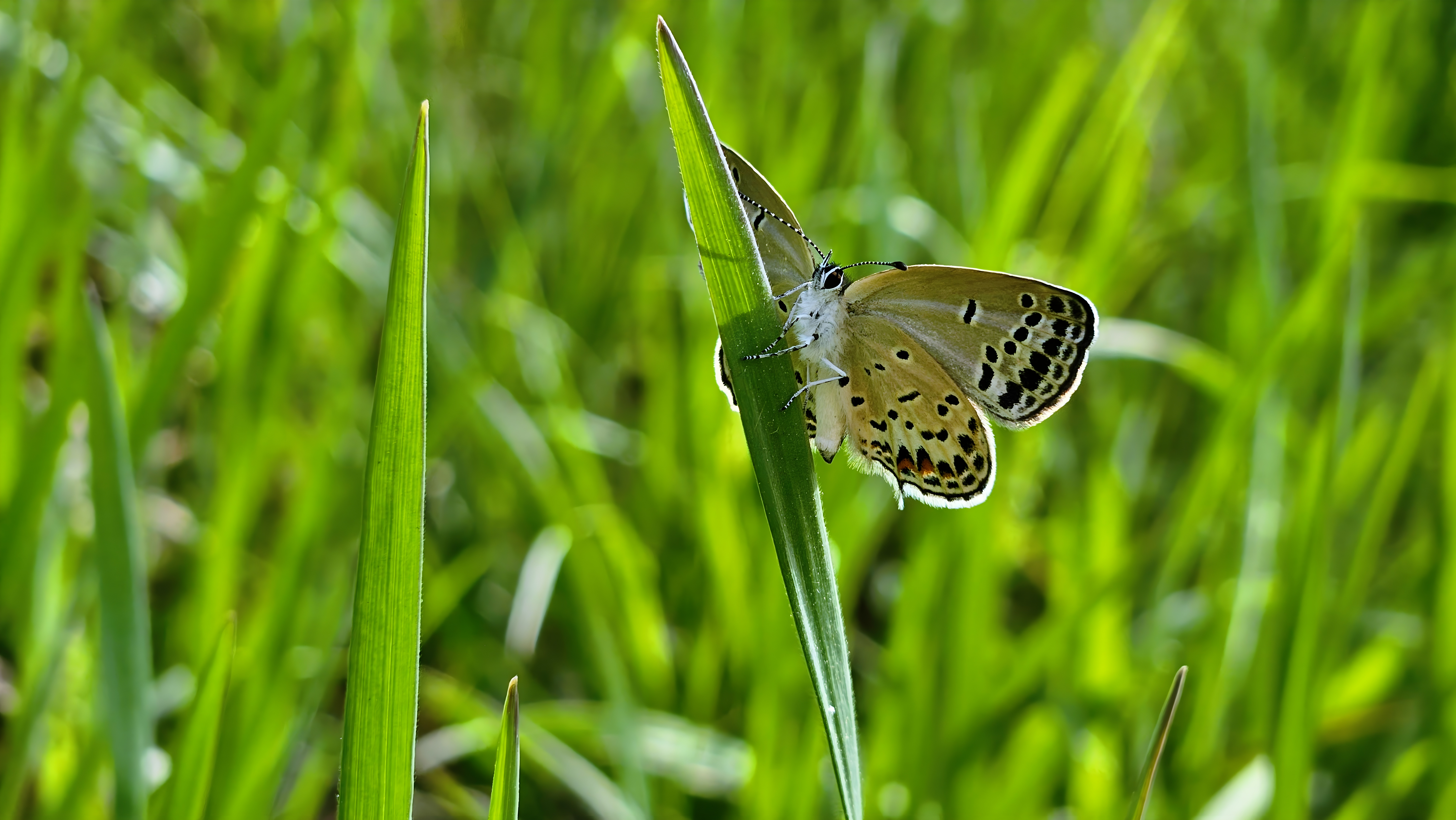먹부전나비가 풀잎에서 쉬고 있다. #풀잎 #나비 #부전나비과 #먹부전나비 [원본: 해상도 = 8000x4504, 크기 = 5.4MiB]