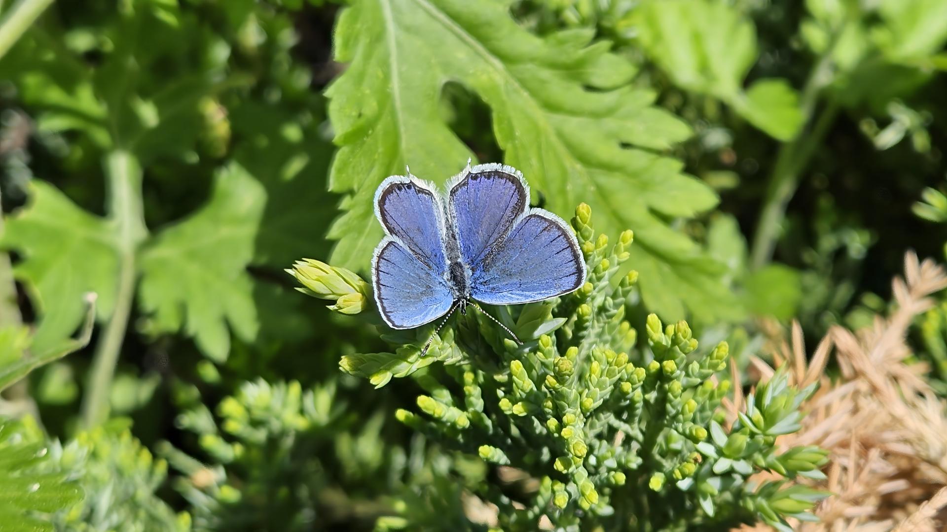 암먹부전나비 수컷이 눈향나무 잎에서 잠시 일광욕
