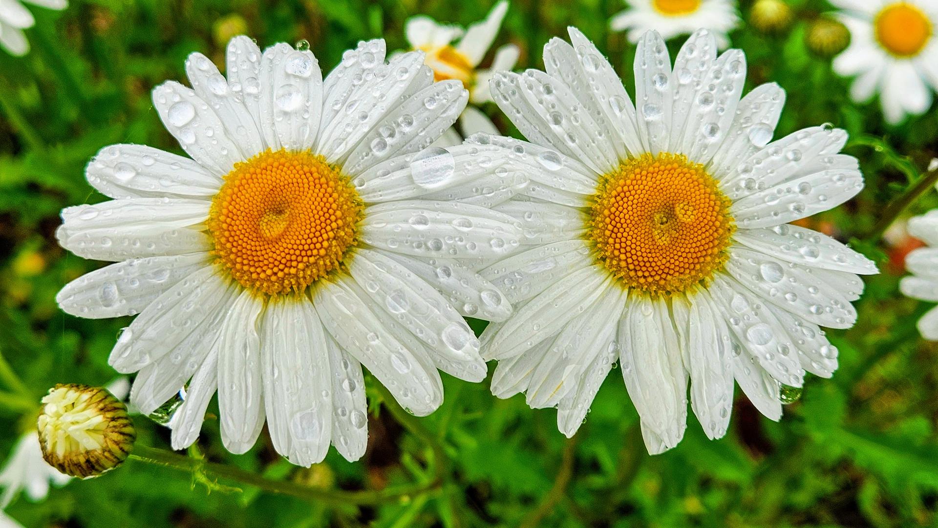 빗방울이 맺혀 생기 있는 데이지 꽃 두 송이 #물방울 #꽃 #국화 #데이지 [원본: 해상도 = 4000x2252, 크기 = 1.9MiB]