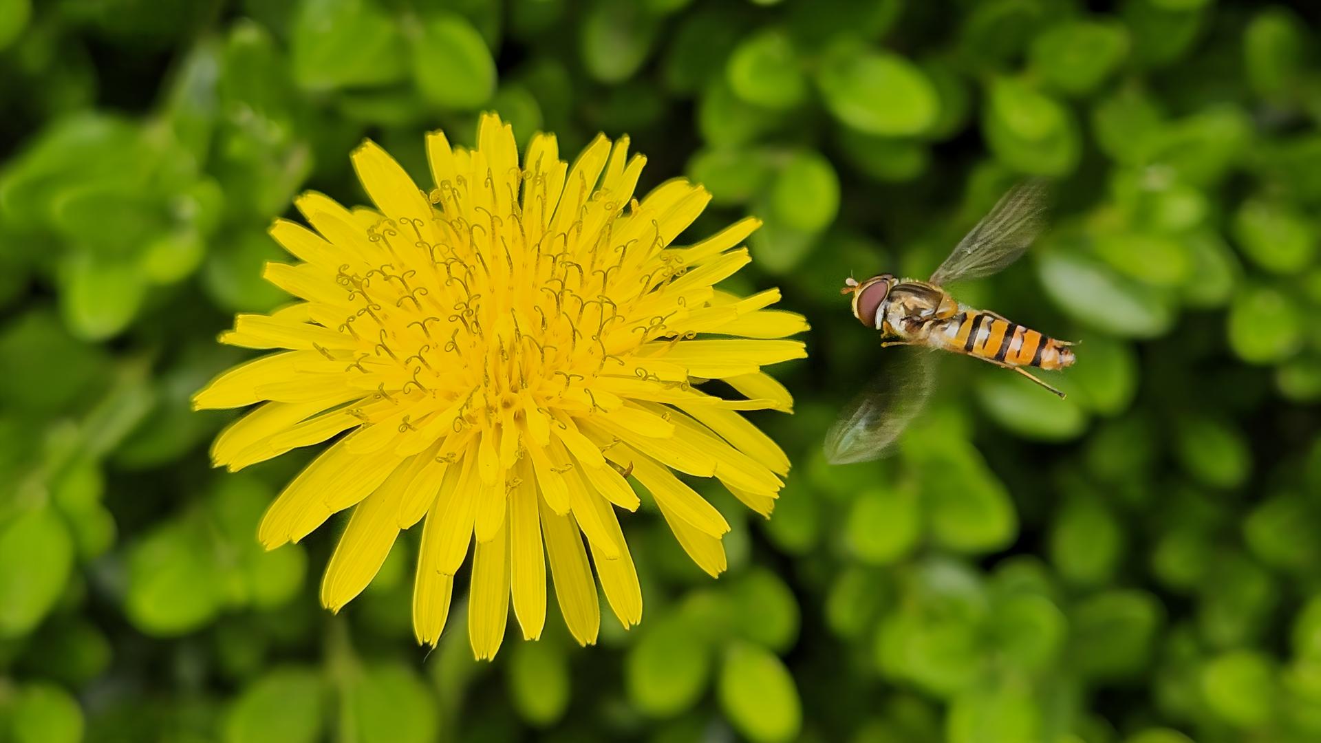 서양민들레 꽃으로 날아드는 호리꽃등에