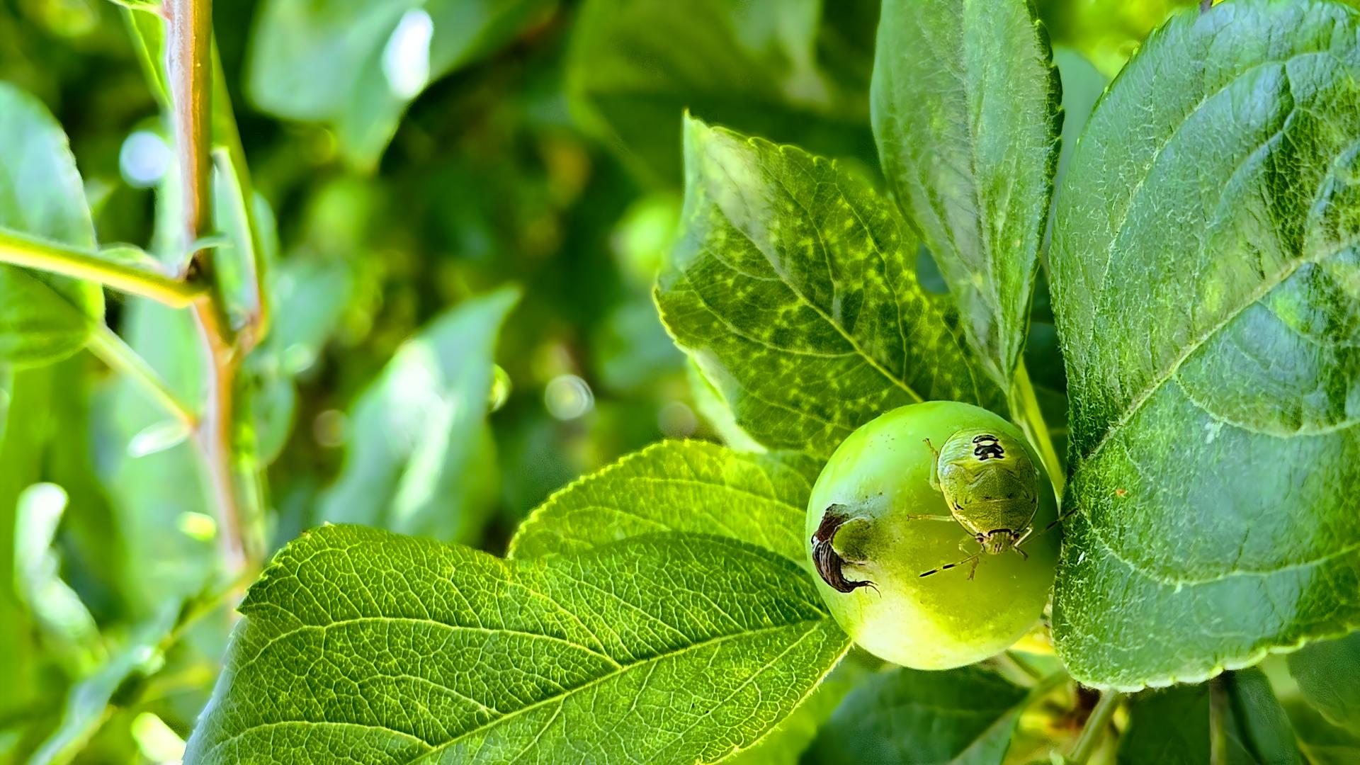 선장 이모티콘을 달고 꽃사과에 매달린 갈색날개노린재 약충