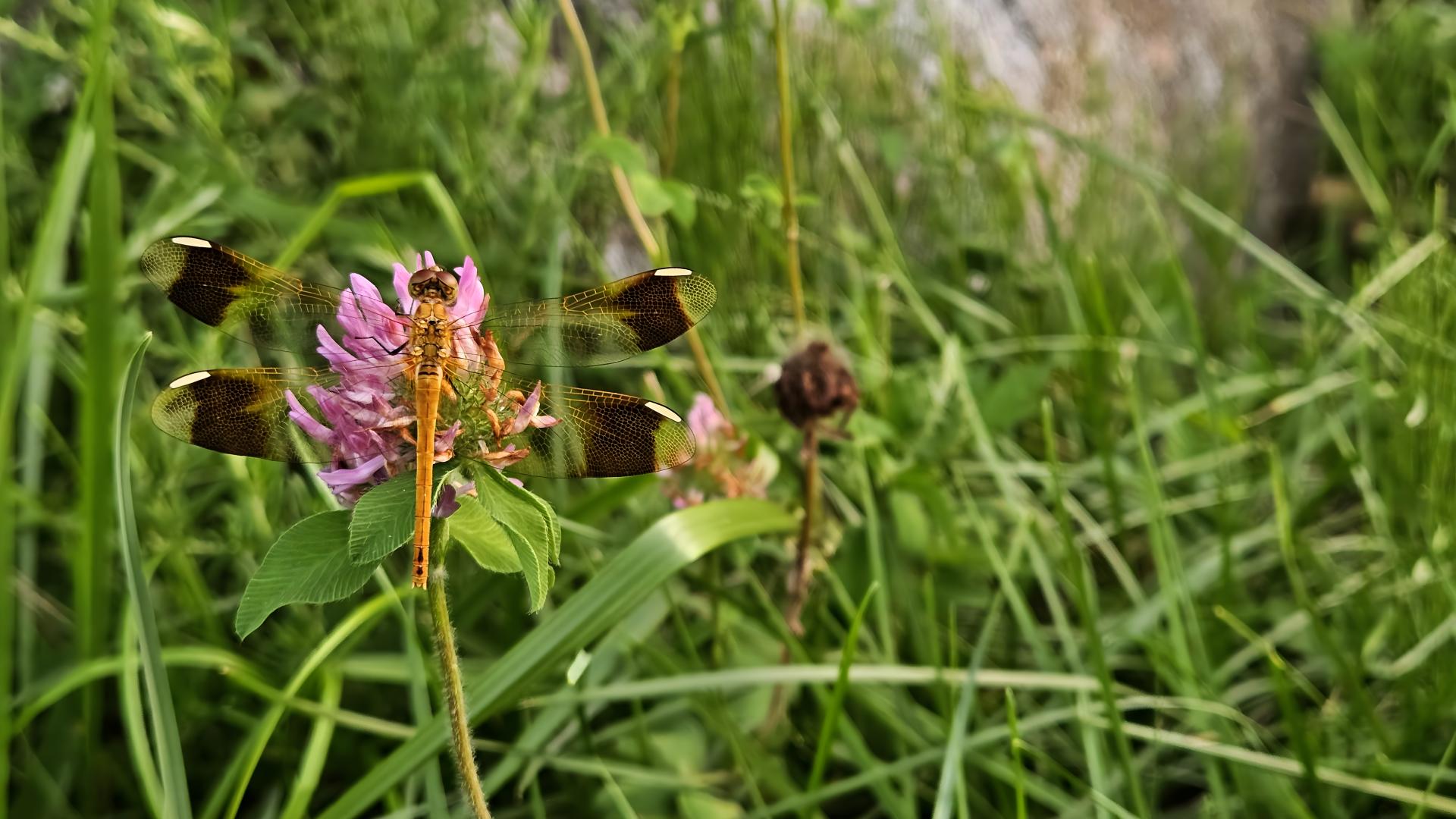 붉은토끼풀 꽃에서 쉬는 날개띠좀잠자리 암컷 #붉은토끼풀 #잠자리 #날개띠좀잠자리 [원본: 해상도 = 8000x4504, 크기 = 5.6MiB]