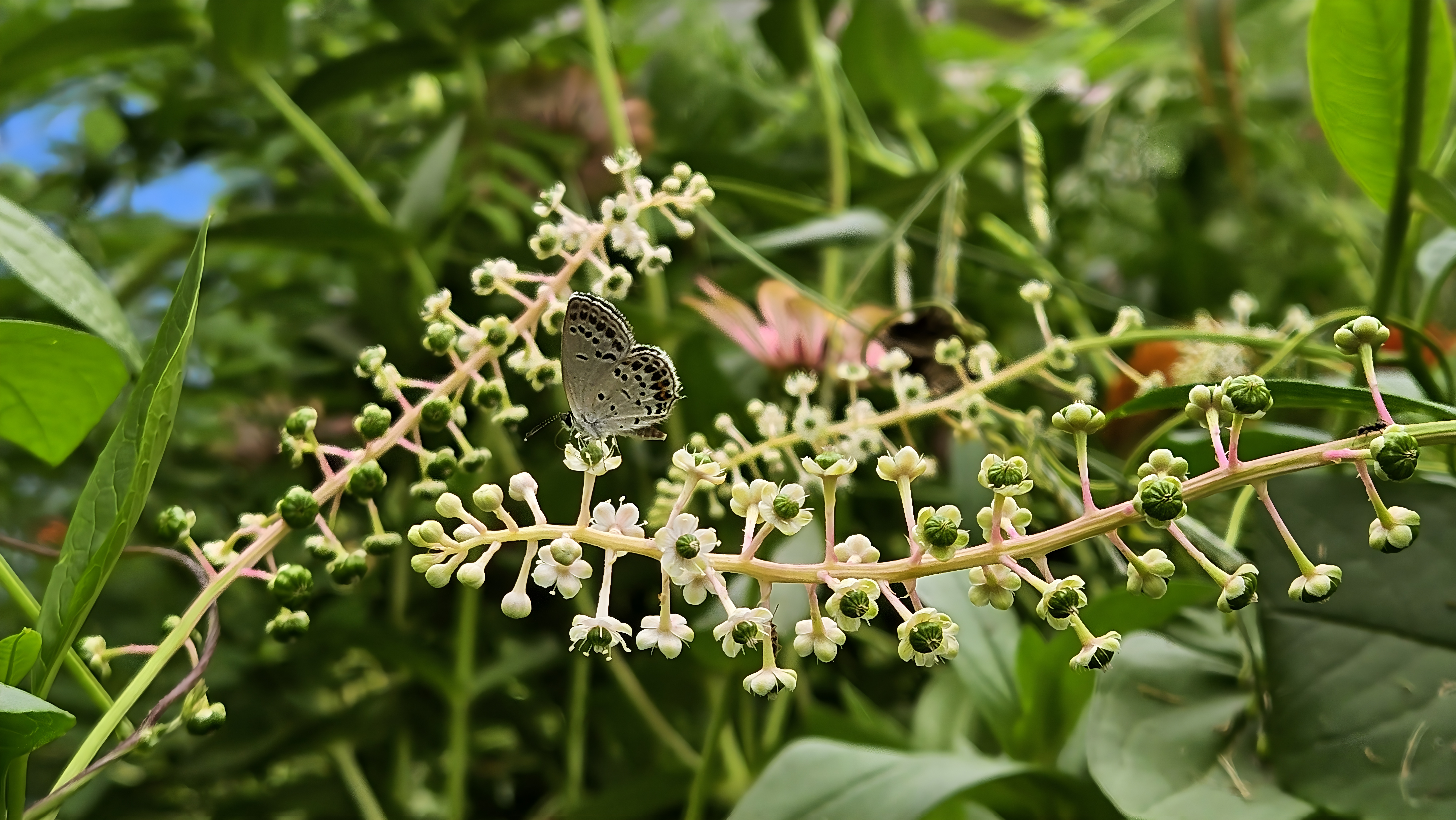 미국자리공 꽃의 먹부전나비 #꽃 #미국자리공 #열매 #나비 #부전나비과 #먹부전나비 [원본: 해상도 = 8000x4504, 크기 = 6.7MiB]