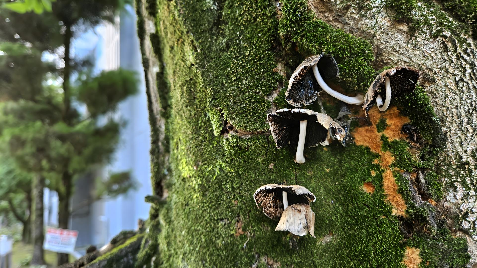 가로수 줄기에서 자라는 이끼와 속이 검게 지는 두엄흙물버섯(추정)