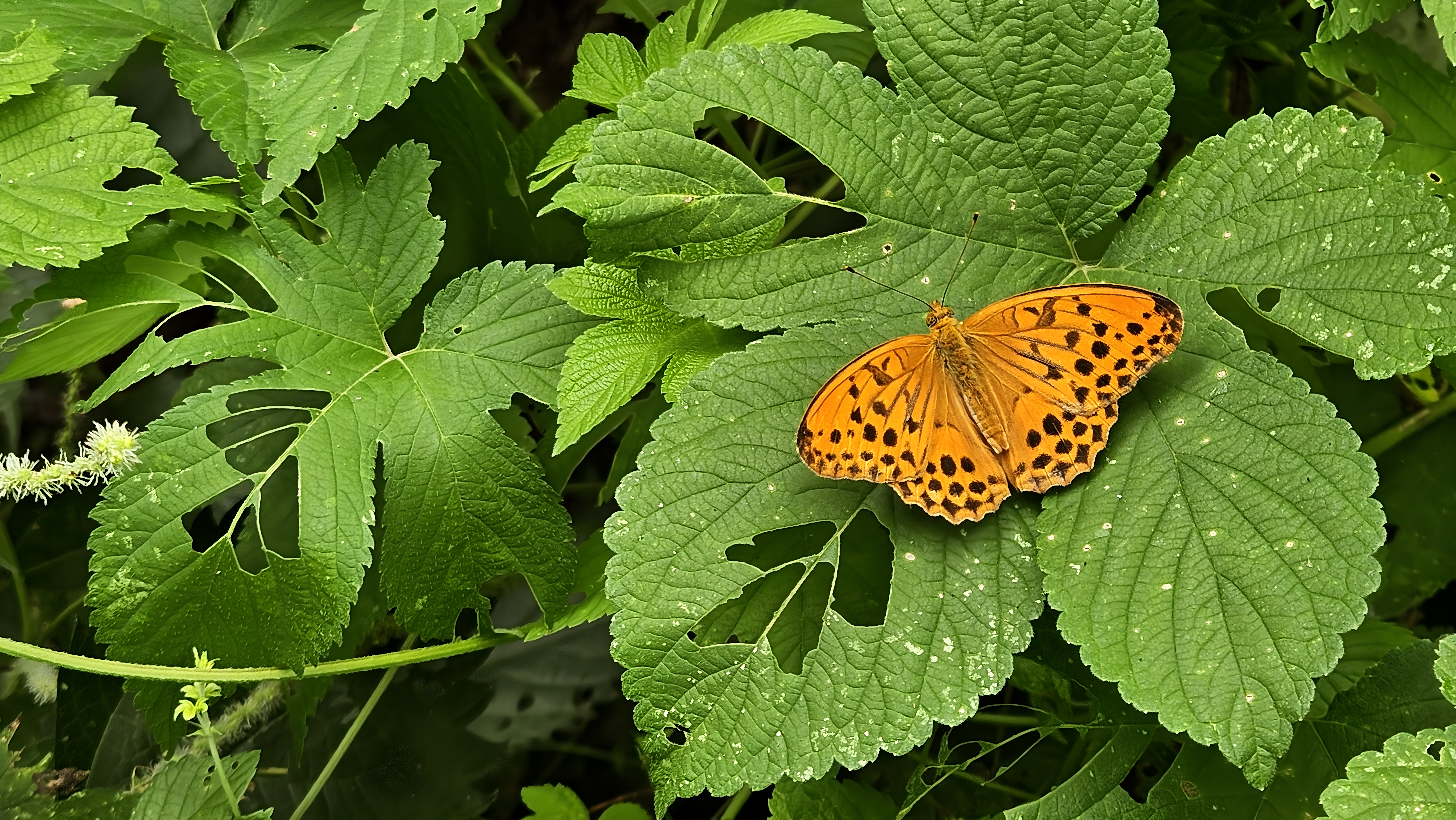 환삼덩굴 잎에 앉은 은줄표범나비(추정) #잎 #환삼덩굴 #나비 #은줄표범나비 [원본: 해상도 = 8000x4504, 크기 = 9MiB]