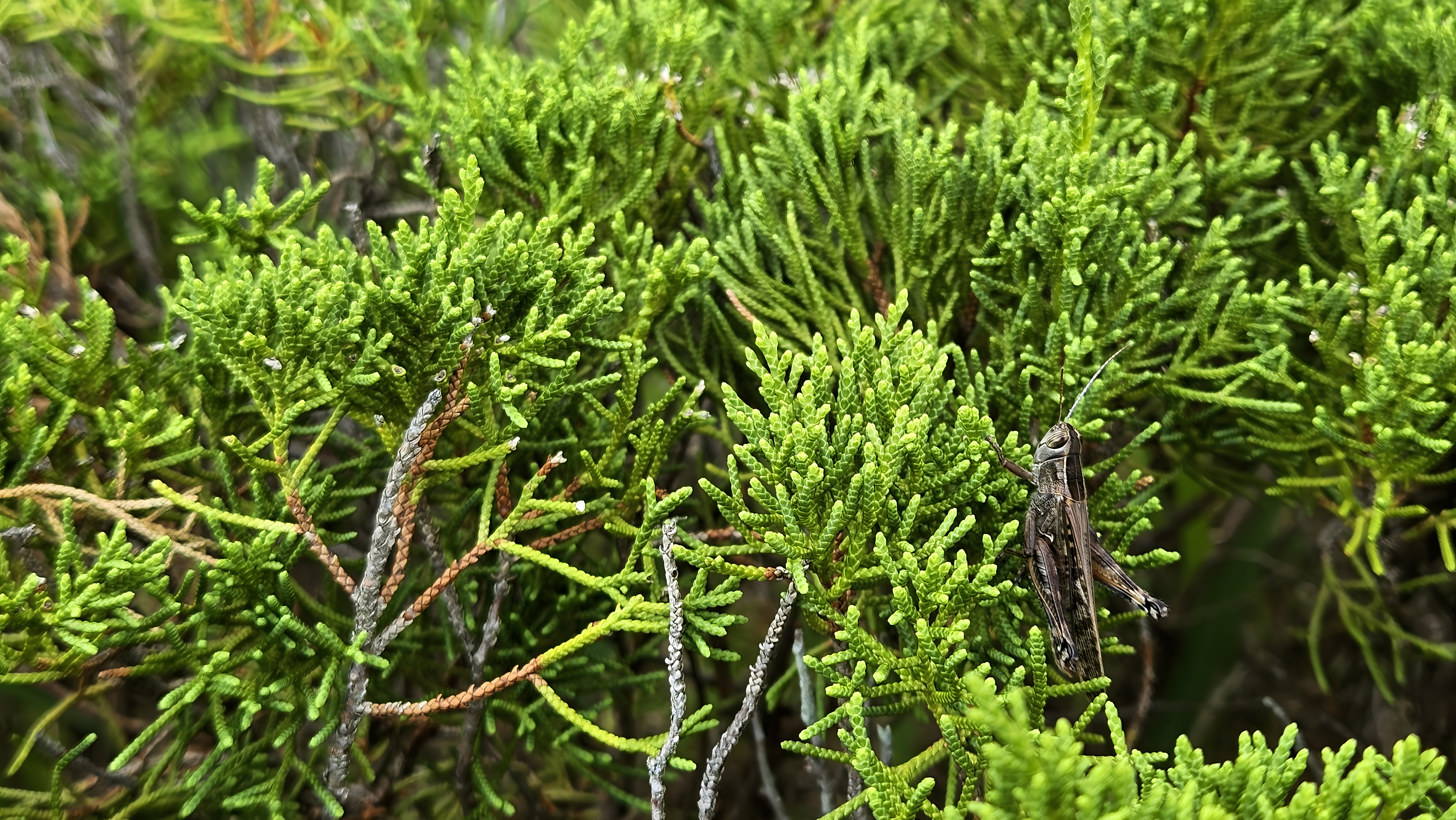 향나무 잎속에 앉은 등검은메뚜기 #나무 #향나무 #메뚜기 #등검은메뚜기 [원본: 해상도 = 8000x4504, 크기 = 8MiB]