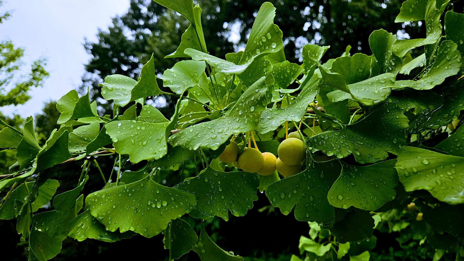 빗물을 머금은 은행나무 잎과 열매 #물방울 #나무 #잎 #은행잎 #열매 #은행나무 [원본: 해상도 = 8000x4504, 크기 = 7.5MiB]