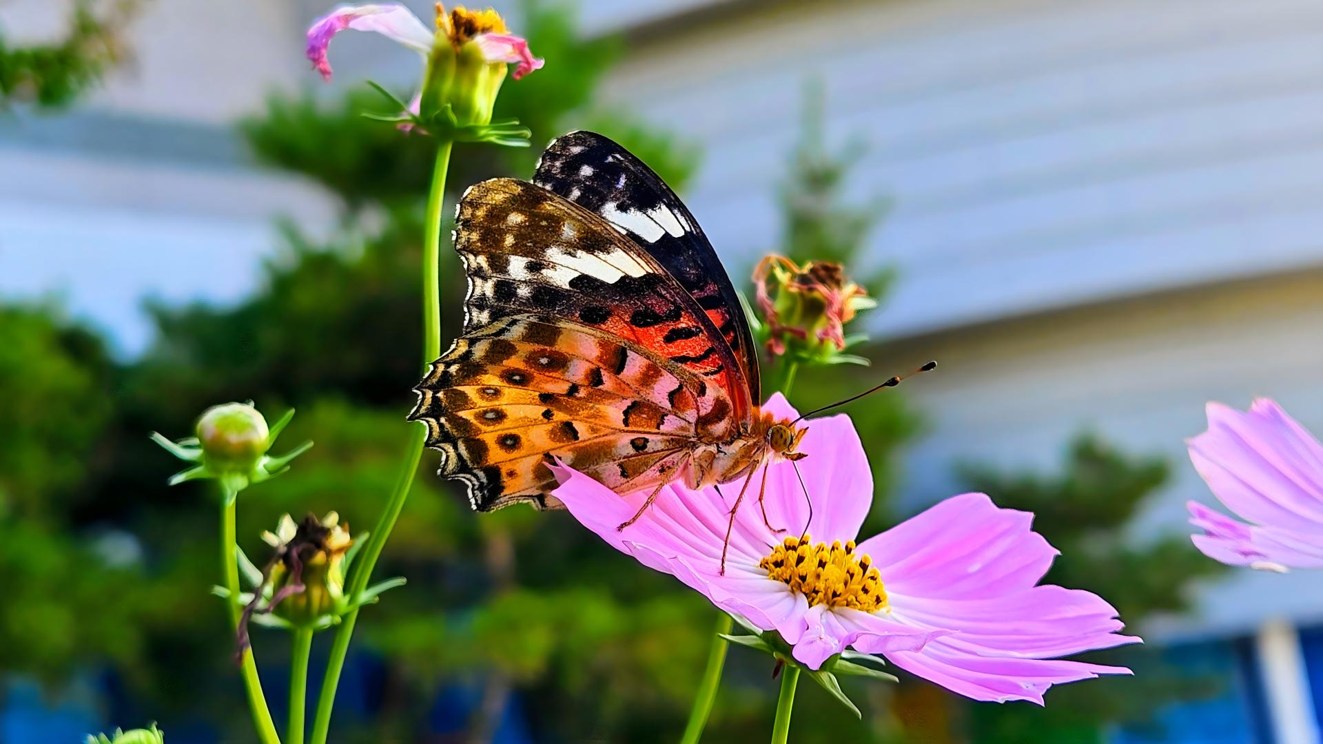 코스모스 꽃에 앉은 암끝검은표범나비 암컷