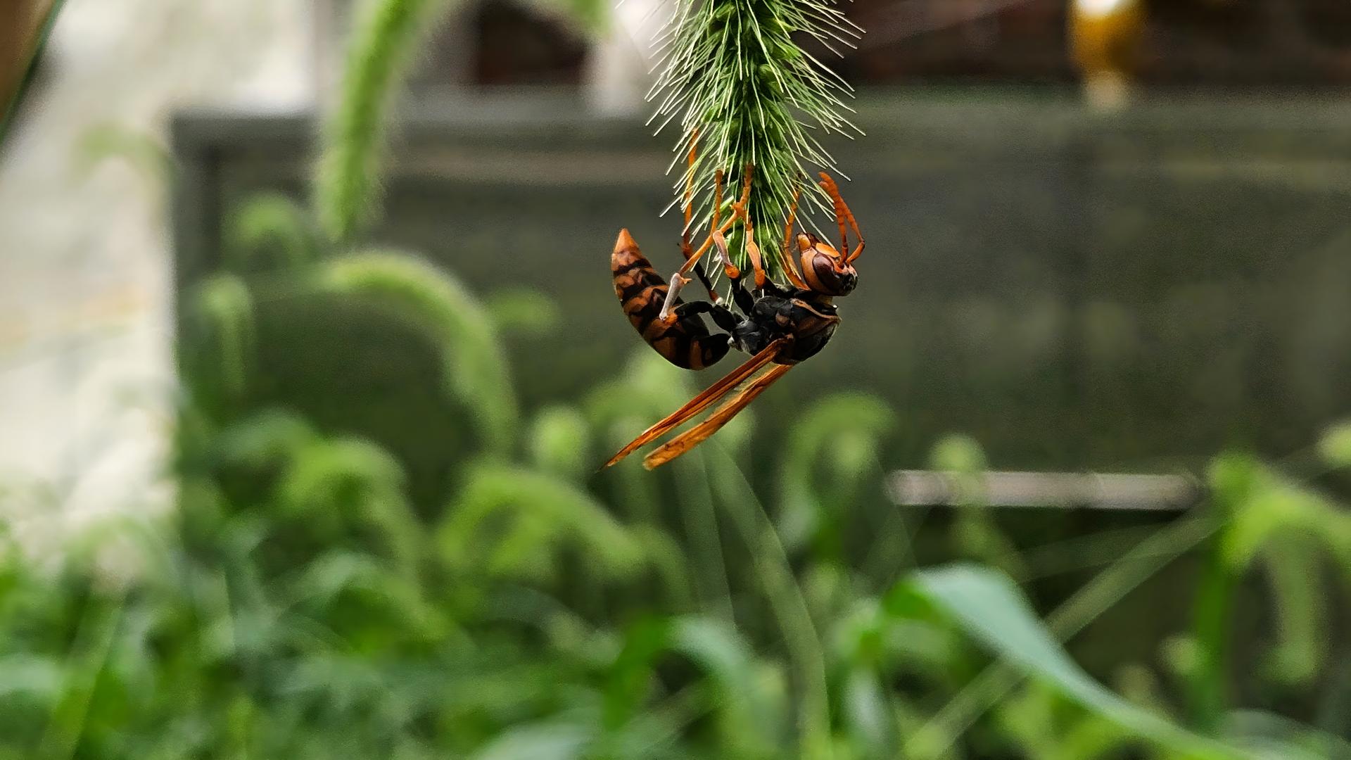 강아지풀 이삭에 매달린 벌(등검정쌍살벌, 추정)