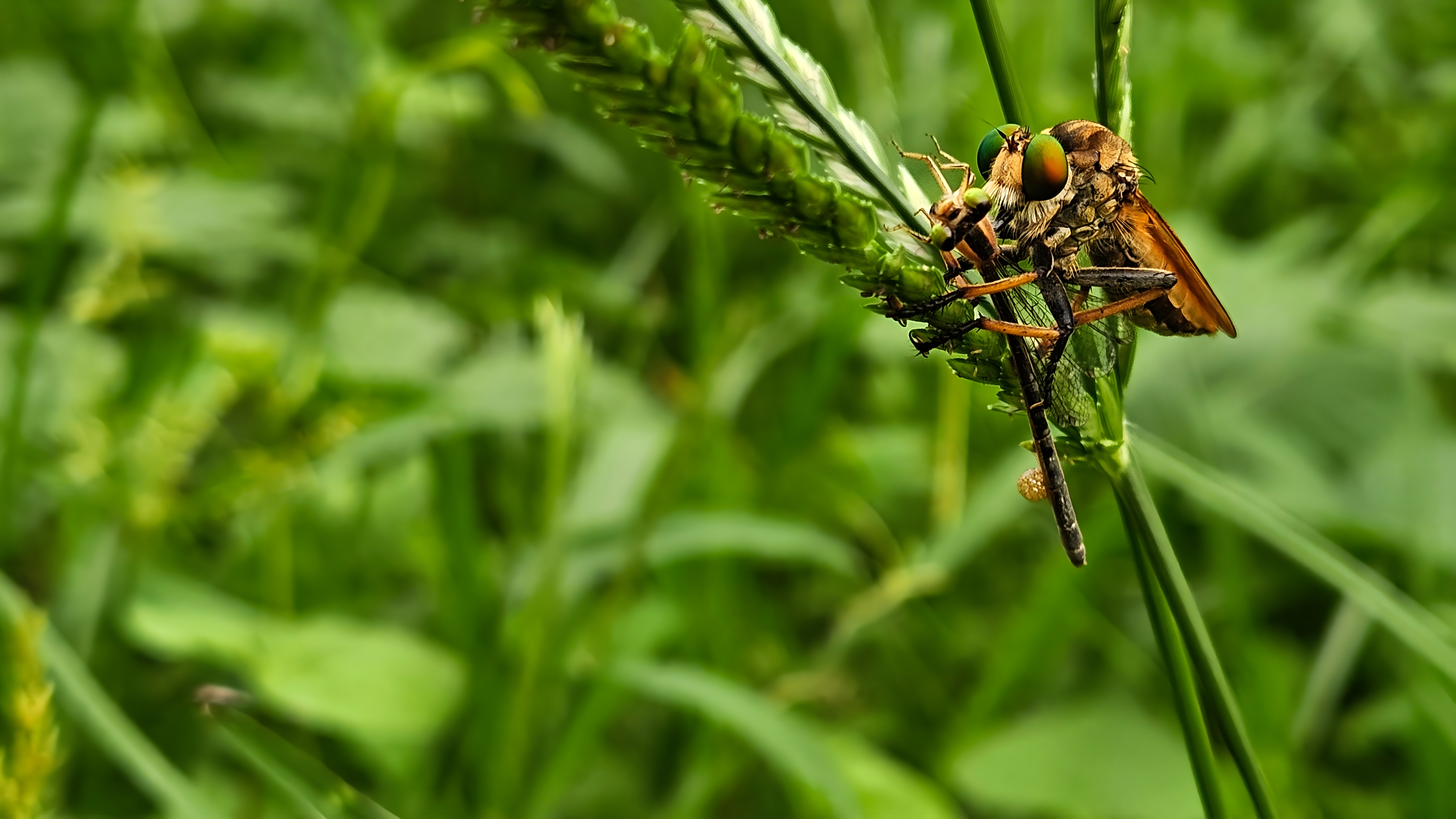 왕바랭이 이삭에서 방울실잠자리(추정)를 포식하는 왕파리매