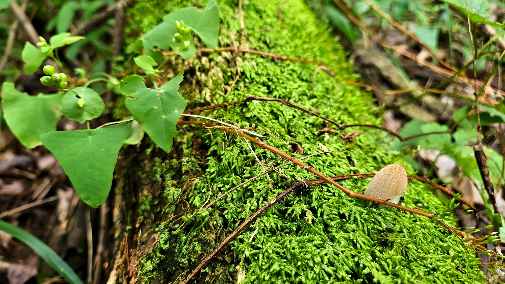 나무줄기의 무성한 이끼사이로 자라는 갈색먹물버섯(추정)