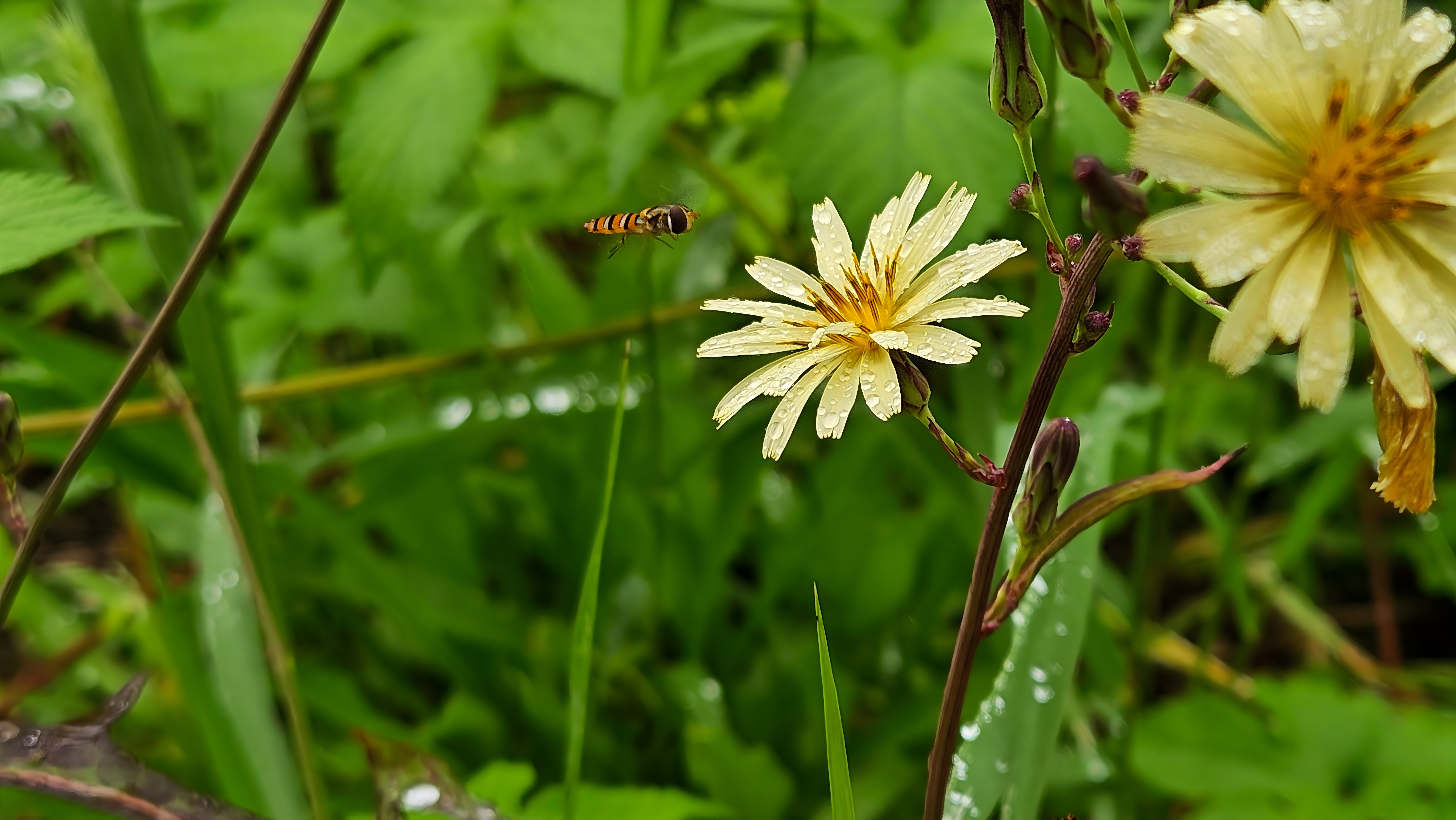 빗속의 왕고들빼기 꽃으로 돌진하는 호리꽃등에