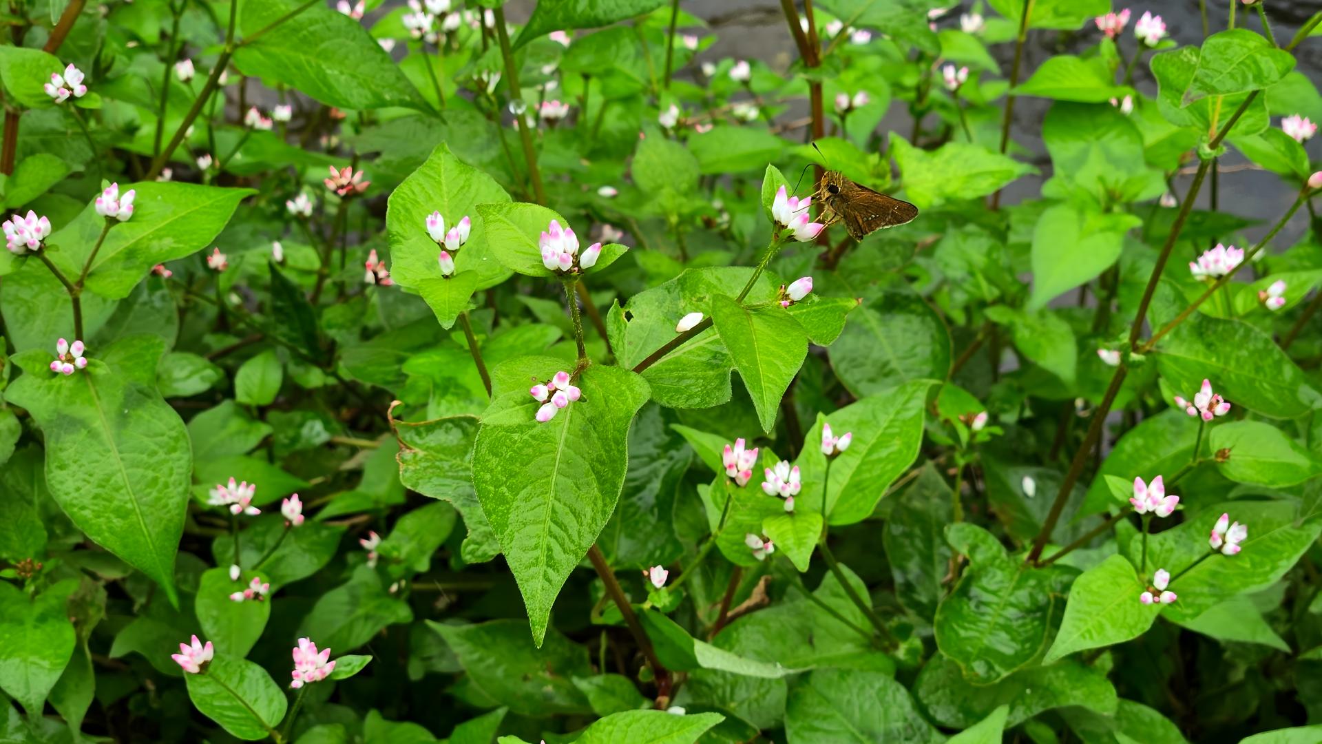 빗속에서도 고마리 꽃밭에서 꽃꿀을 따는 줄점팔랑나비