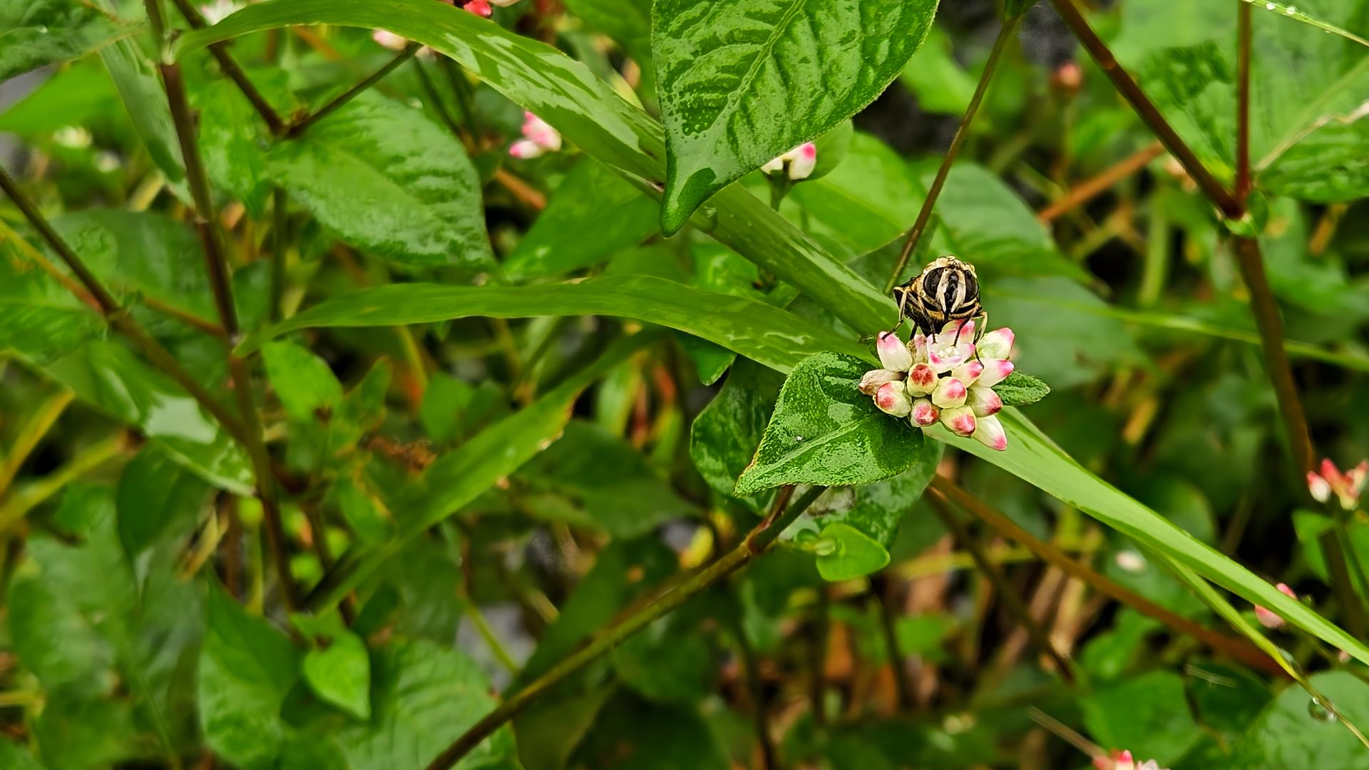 비맞은 고마리 꽃꿀을 빠는 꽃등에(왕꽃등에 추정)