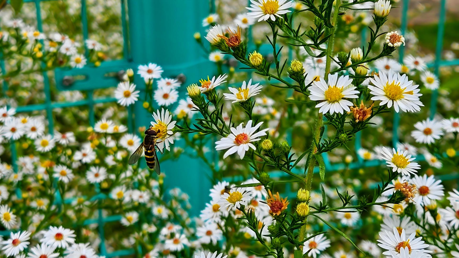 미국쑥부쟁이 꽅밭의 물결넓적꽃등에(추정)