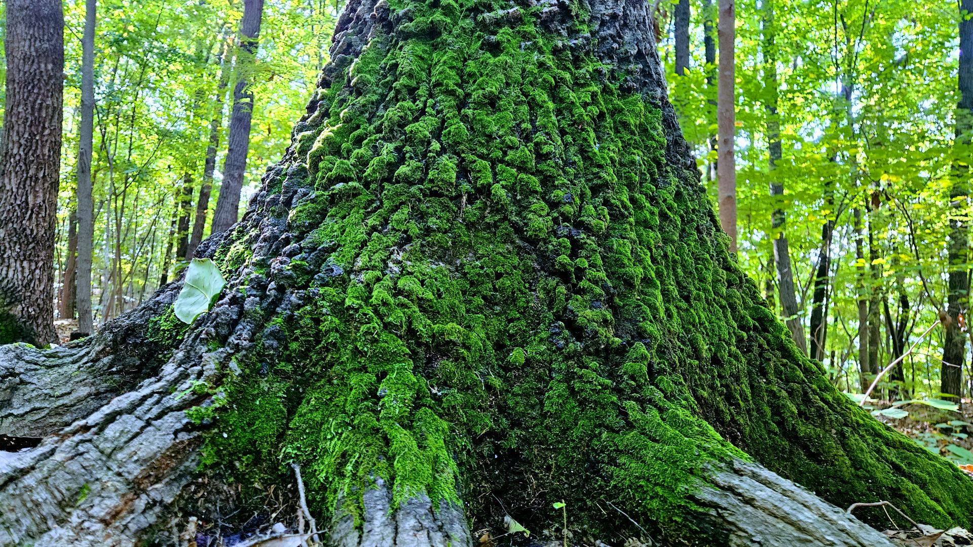 숲속의 상수리나무 밑둥에 자라는 이끼
