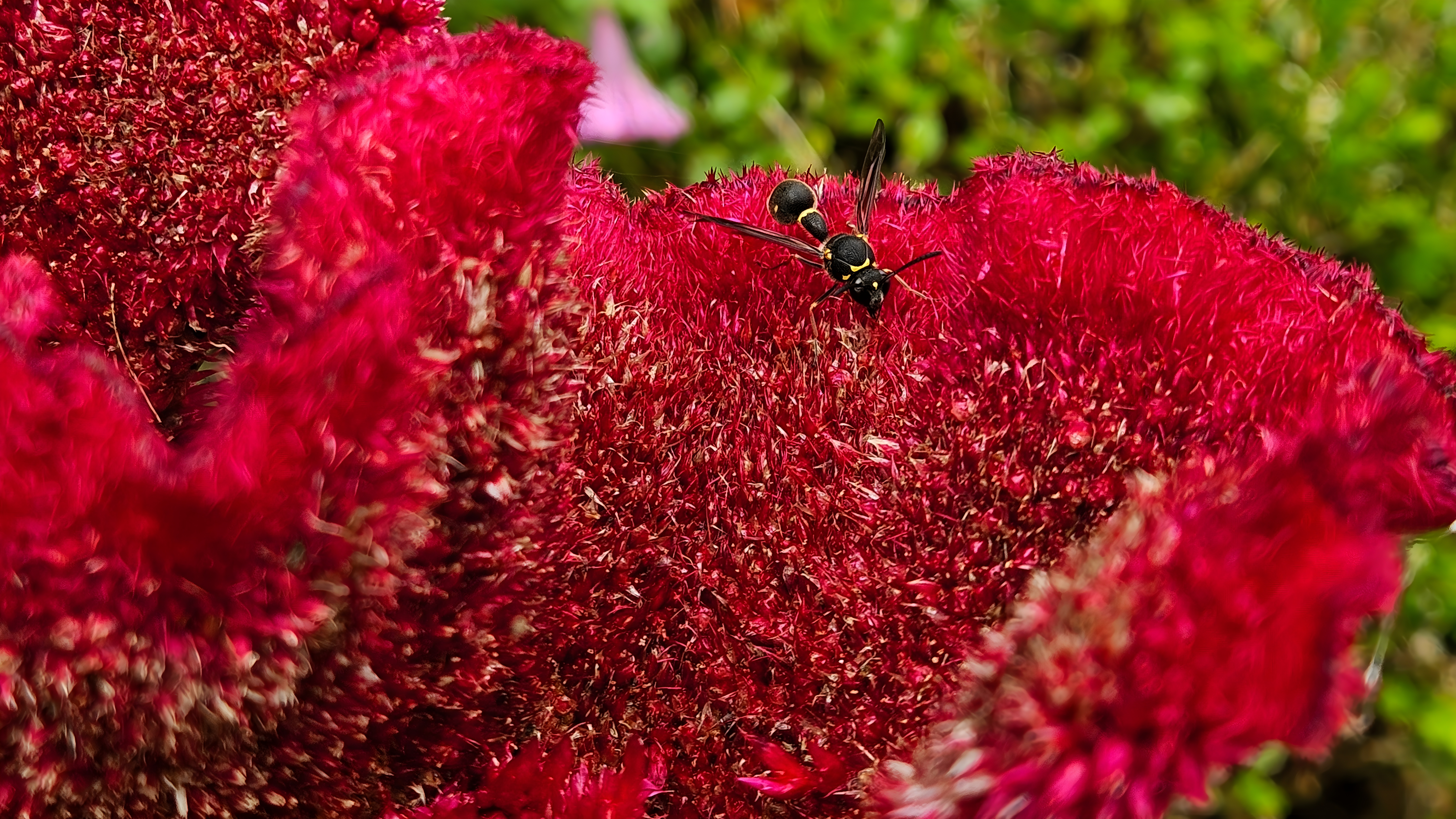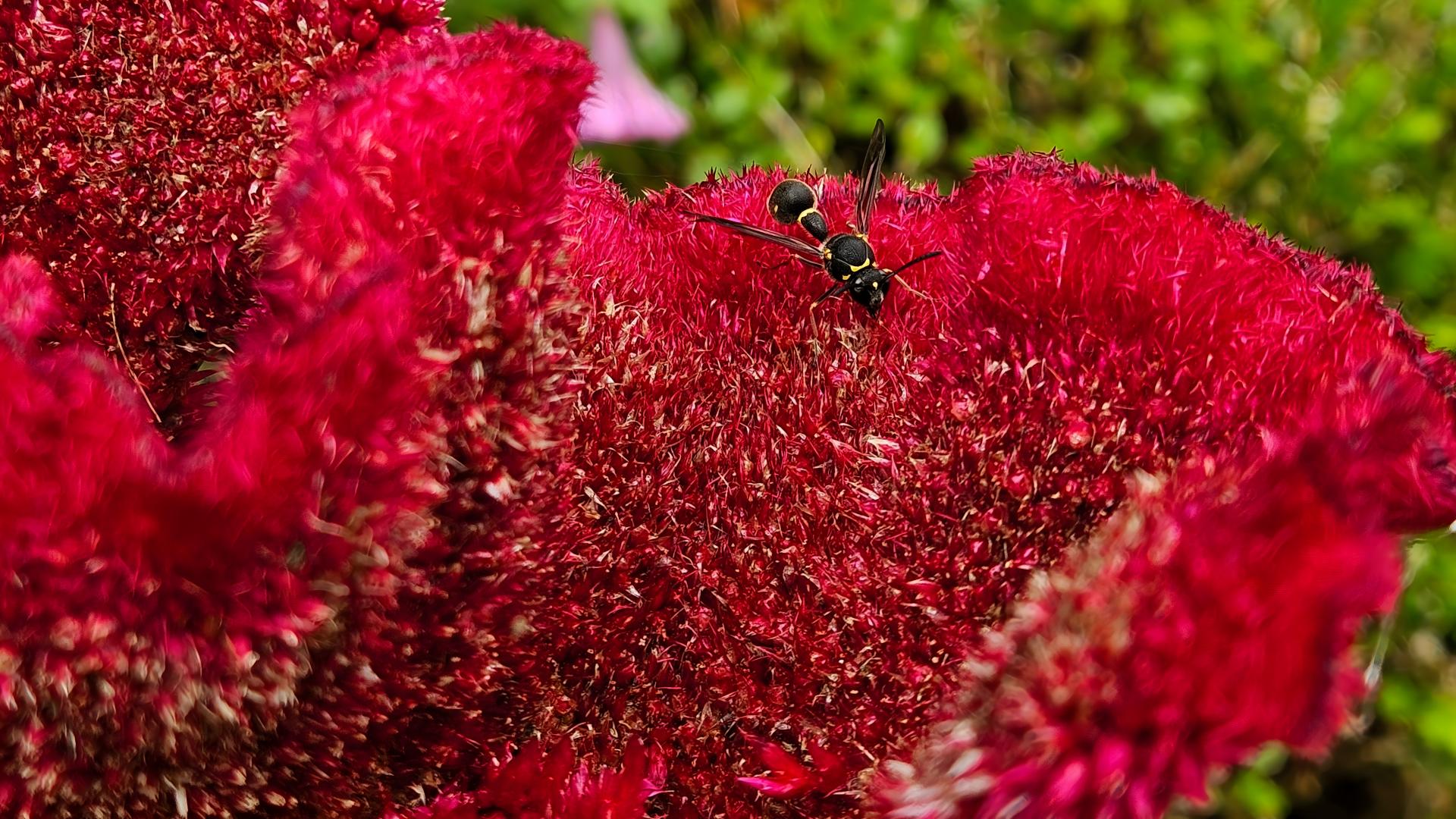 맨드라미꽃에 앉은 점호리병벌(추정) #꽃 #맨드라미 #벌 #점호리병벌 [원본: 해상도 = 8000x4504, 크기 = 7.9MiB]