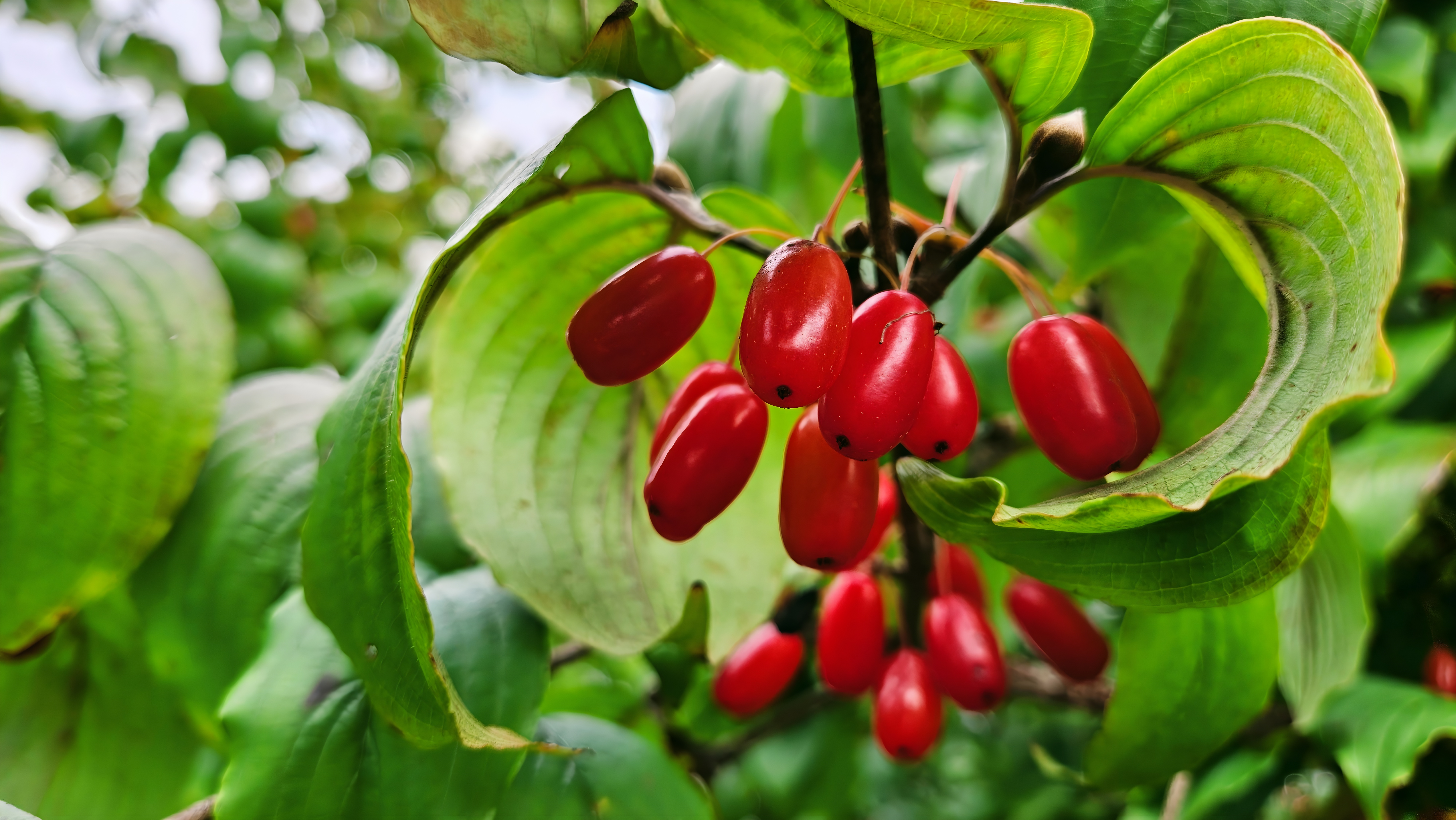 붉은 산수유 열매 #나뭇잎 #열매 #산수유 [원본: 해상도 = 8000x4504, 크기 = 5.3MiB]