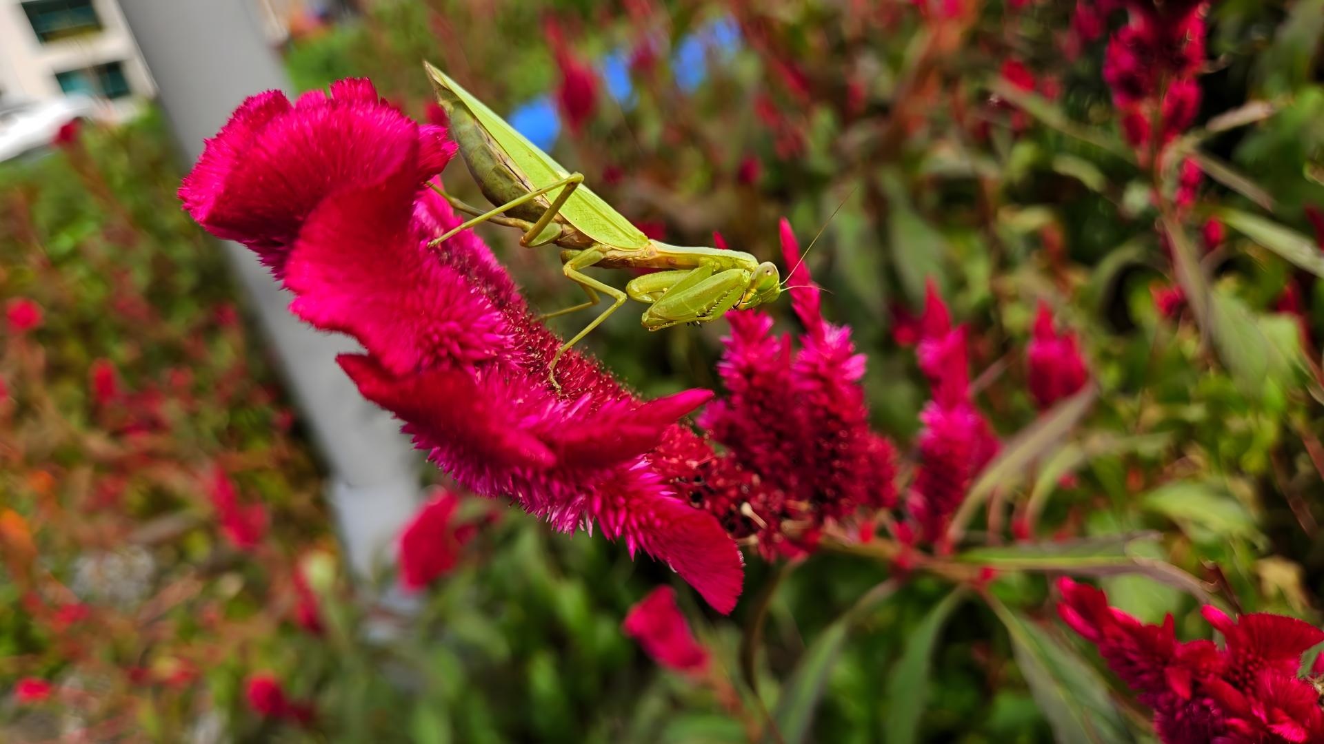 맨드라미 꽃의 넓적배사마귀 #꽃 #맨드라미 #사마귀 #넓적배사마귀 [원본: 해상도 = 8000x4504, 크기 = 4.7MiB]