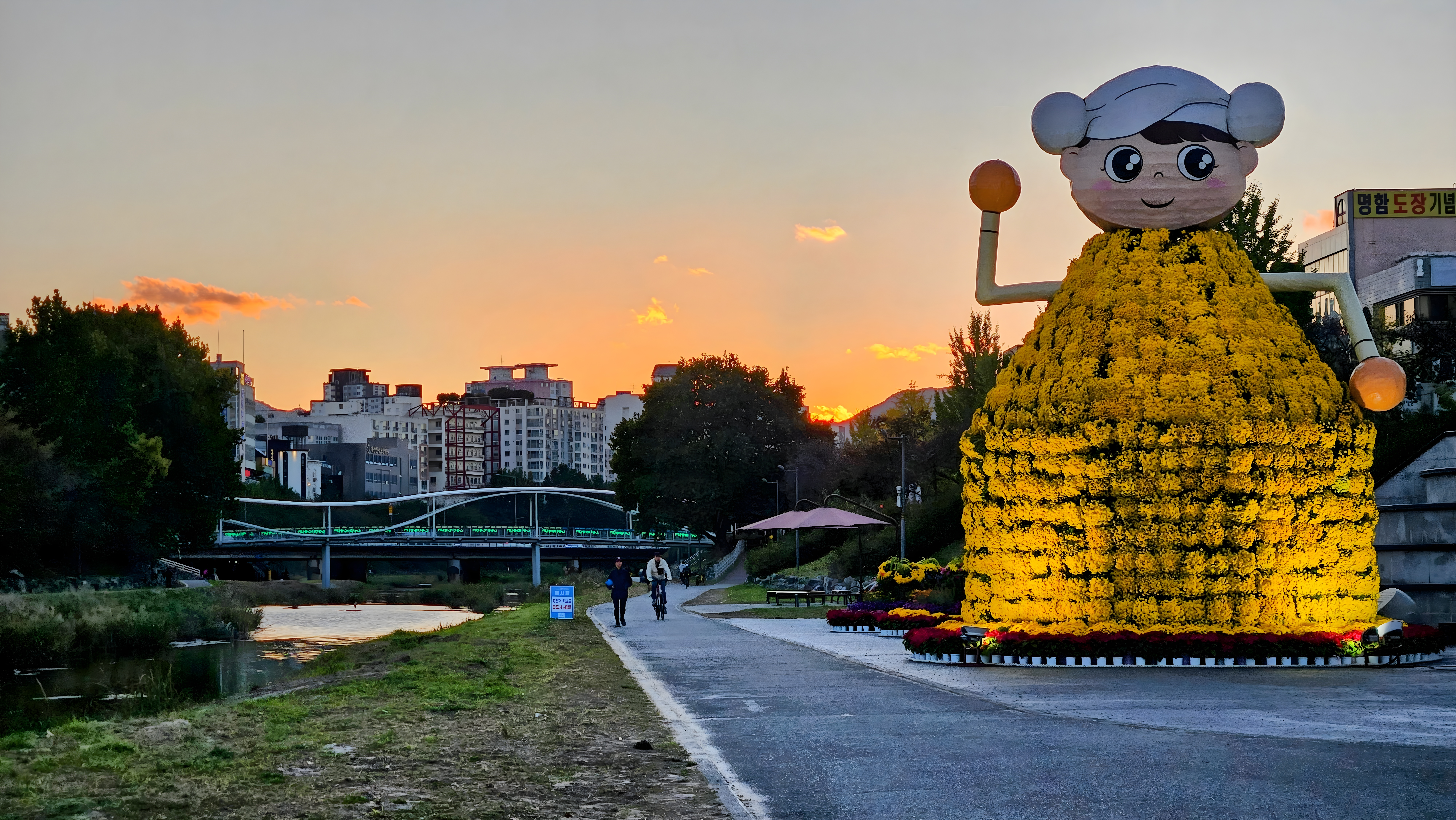 저녁노을이 밀려오는 축제장 냇가 풍경
