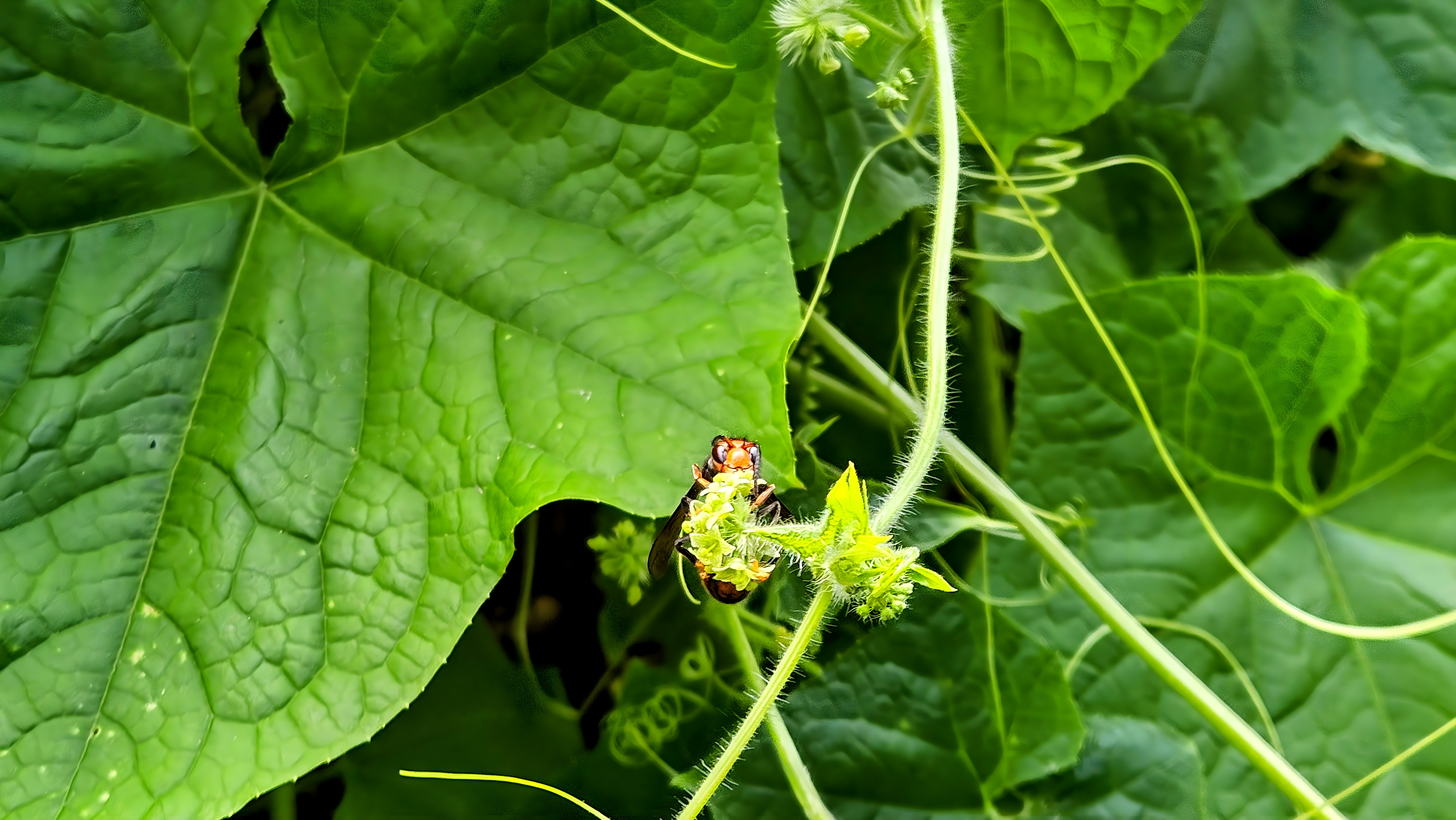 가시박 꽃꿀을 따는 등검은말벌의 '빼꼼!'