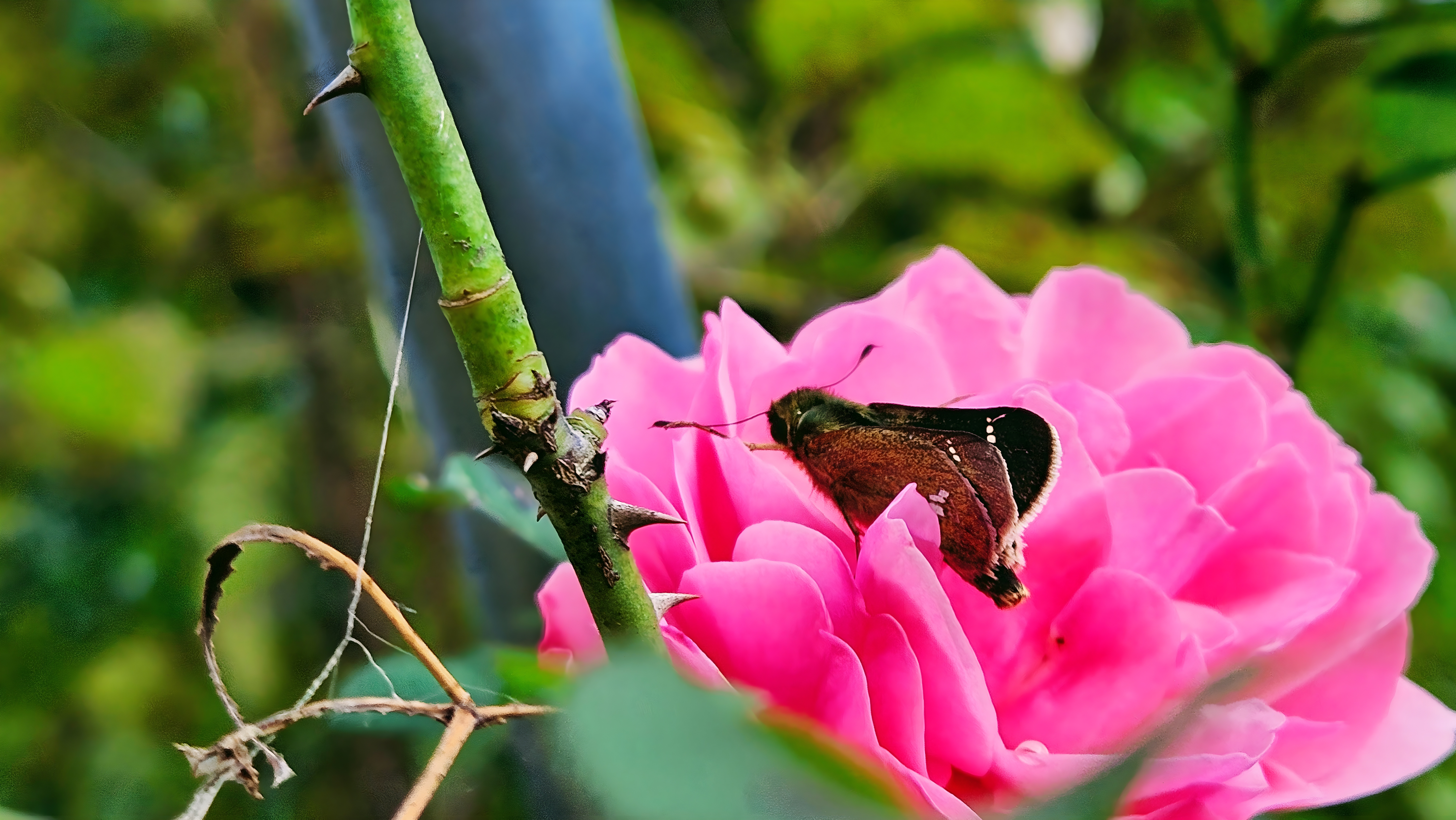 분홍 장미꽃에서 쉬는 줄점팔랑나비 #꽃 #장미꽃 #장미 #가시 #나비 #줄점팔랑나비 [원본: 해상도 = 8000x4504, 크기 = 8.8MiB]