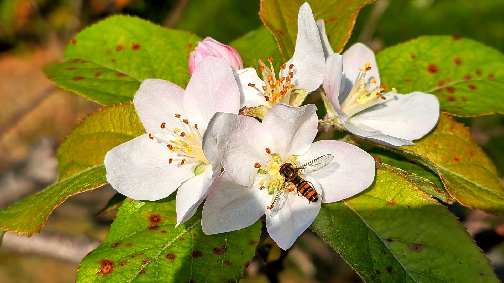 늦가을 뒤늦게 핀 사과꽃과 호리꽃등에