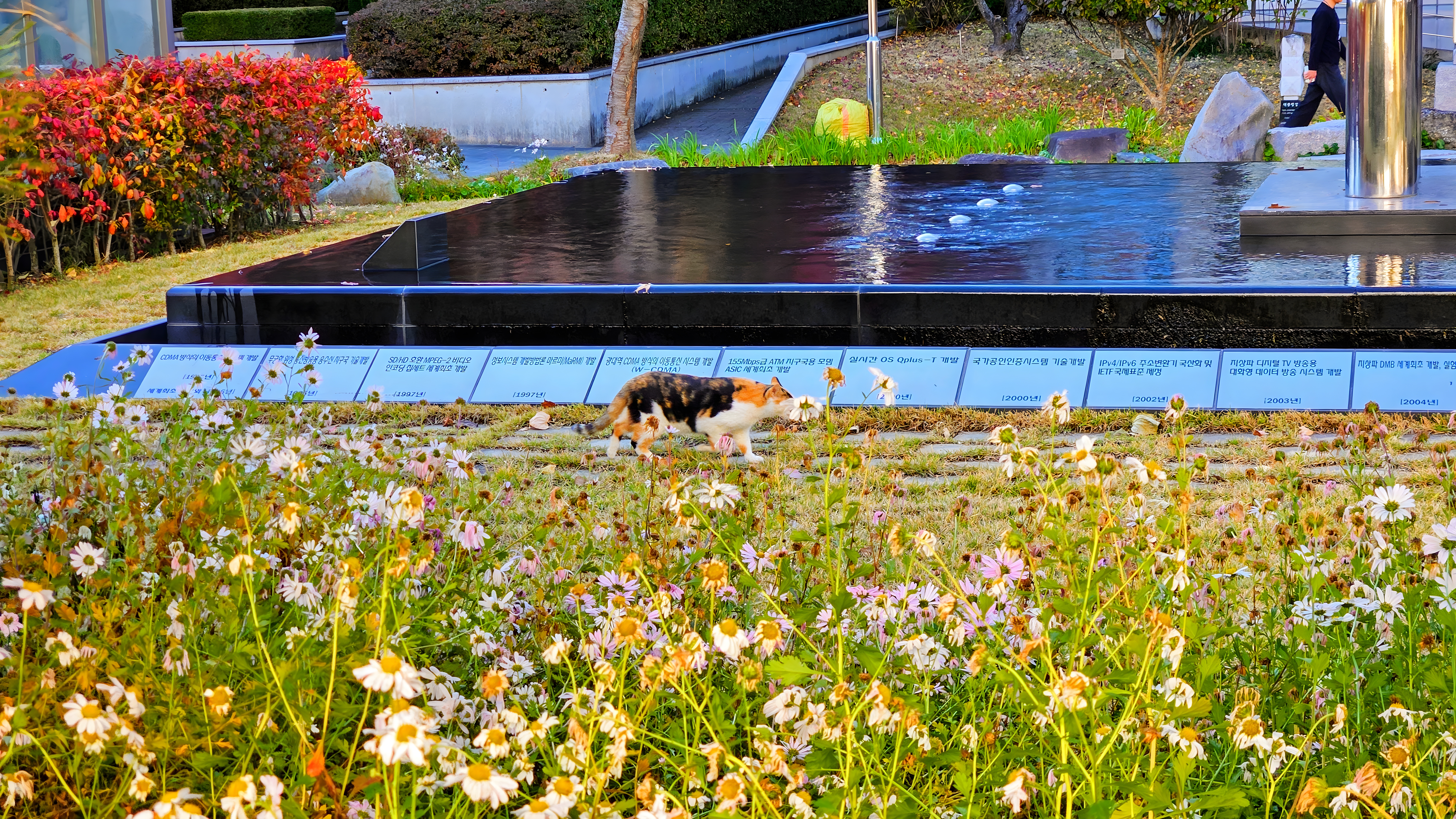 구절초 화단을 지나는 고양이 #꽃 #구절초 #고양이 #분수 #연못 [원본: 해상도 = 8000x4504, 크기 = 13.4MiB]