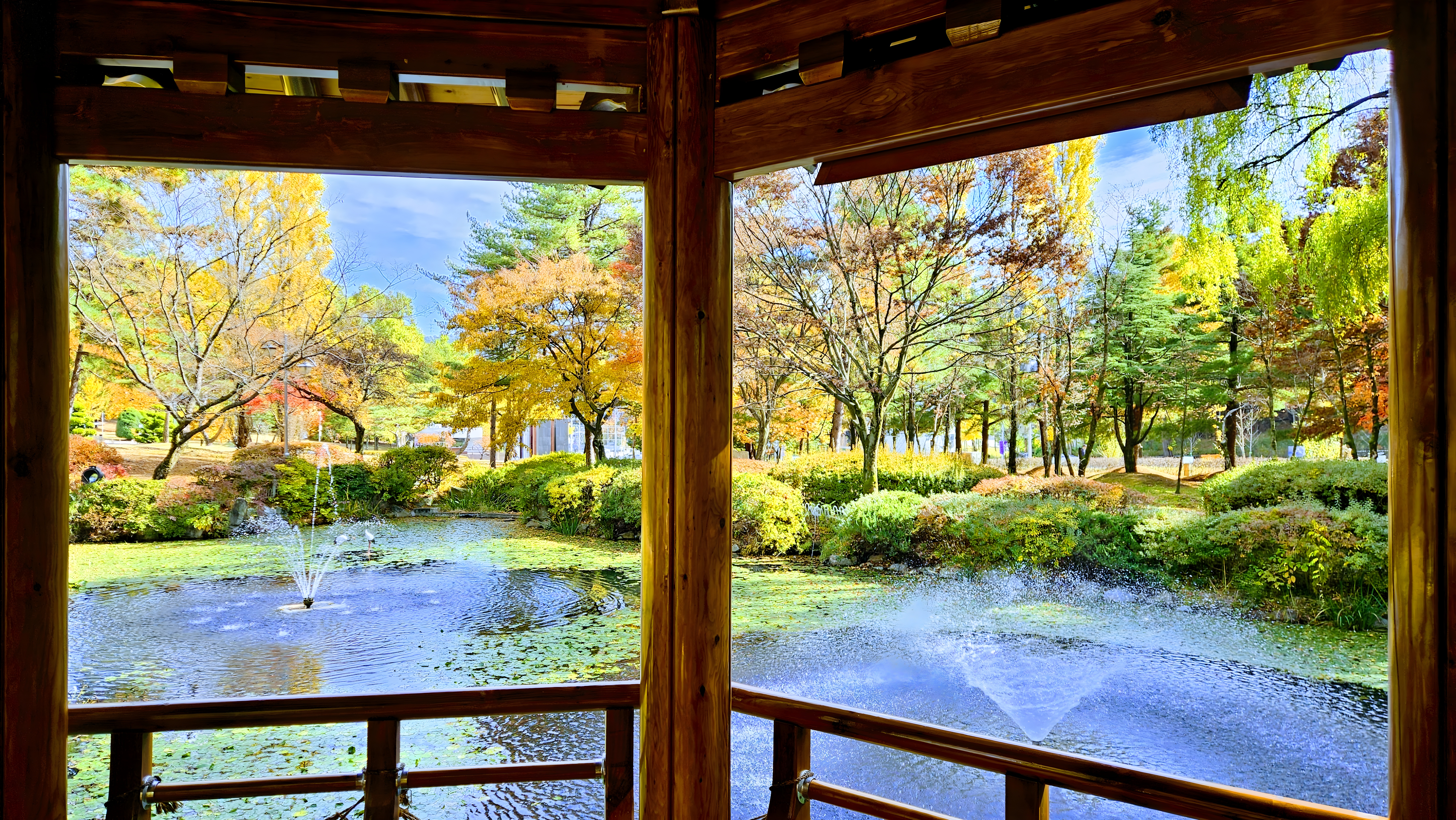 정자에서 보는 가을 연못의 분수