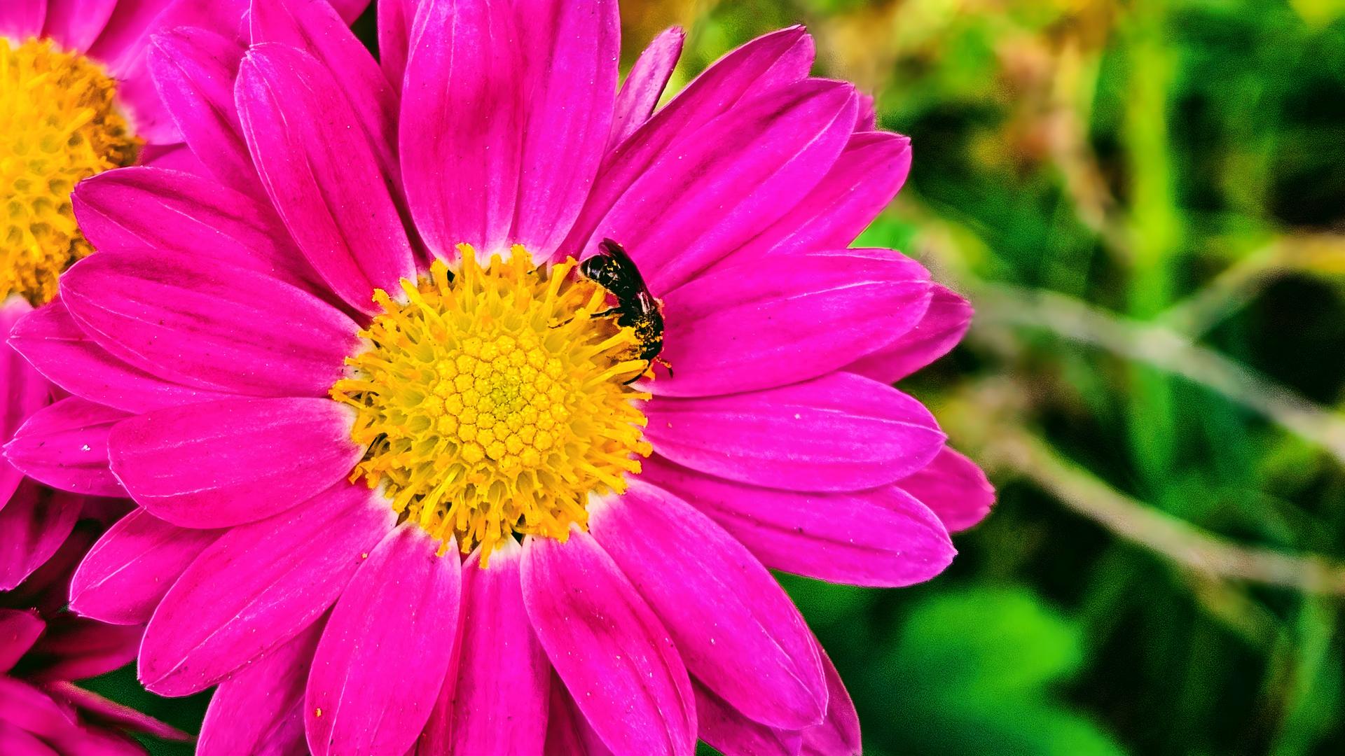 국화꽃에서 꿀을 따는 작은 벌(아마도 어리흰줄애꽃벌)